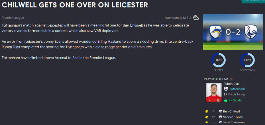 We had a chance to clinch the Prem yet again and the kids, for the 2nd straight match, clearly felt the pressure and weren’t up to par. Wolves were by far the better team and we relied on luck and individual talent really to escape alive from the Mol. Shout out to Hugo Lloris for finally simulating what he’s like in real life, when he literally passed the ball to an opponent to score an easy goal. He’s already on my exit plans, and with these moves he really doesn’t make a case to stay with a lesser role or in a coach capacity. We pretty much played 10 against 12 with Hugo in there. His little present was the beginning of the end and Maddison was the only one that was able to save us wih an impeccable solo effort that will likely end up in the season highlight reel.