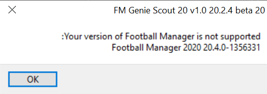 Based on the screenshot you sent just there, it looks like you are using the public (free) version of Genie Scout? It is not (currently) intended to work with the latest update of FM (20.4). Eugene (Genie) delays the release of the updated public version for Genie Scout for the winter patch of the game (20.3/20.4) to reward users of the 'g' edition. Public version is expected to be updated tomorrow. You can find more news about the update time of the public version on the comments section of the download page when available.