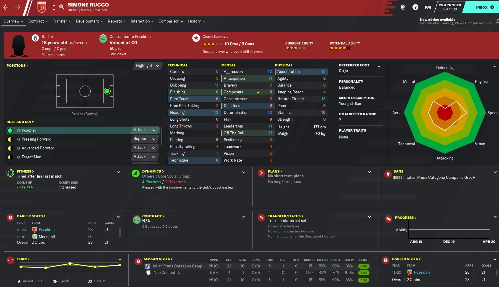 First day as manager of a football club. Poseidon is the perfect starting ground from my new career. Amateur club with godawful staff and players but predicted to finish top of the Italian Prima Categoria Campania Gruppo F. So, I guess the other teams of this group are even more clueless.