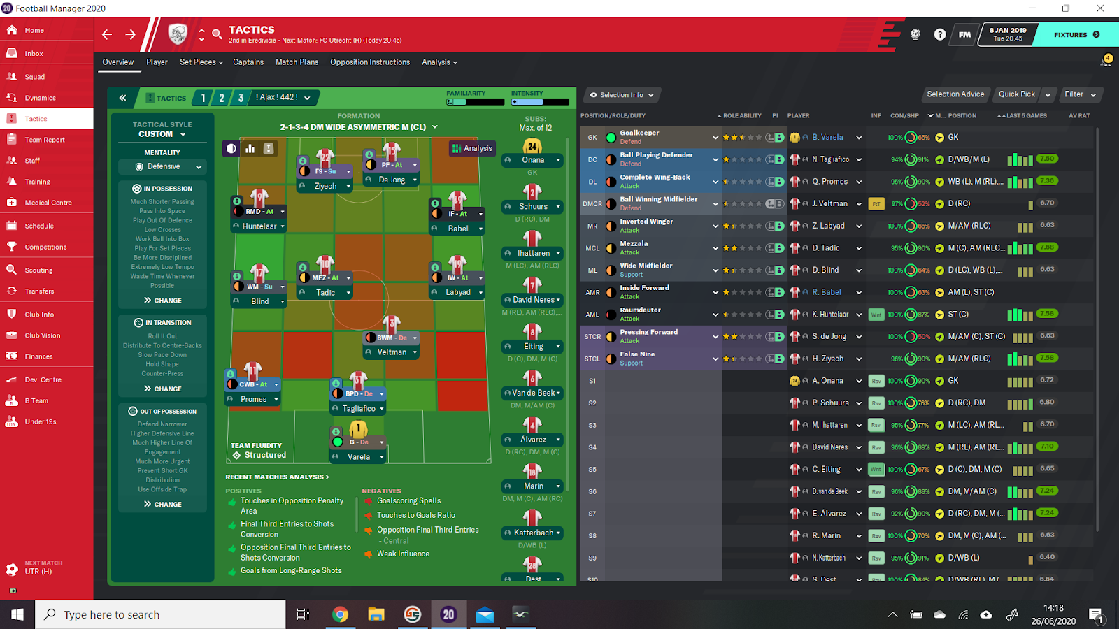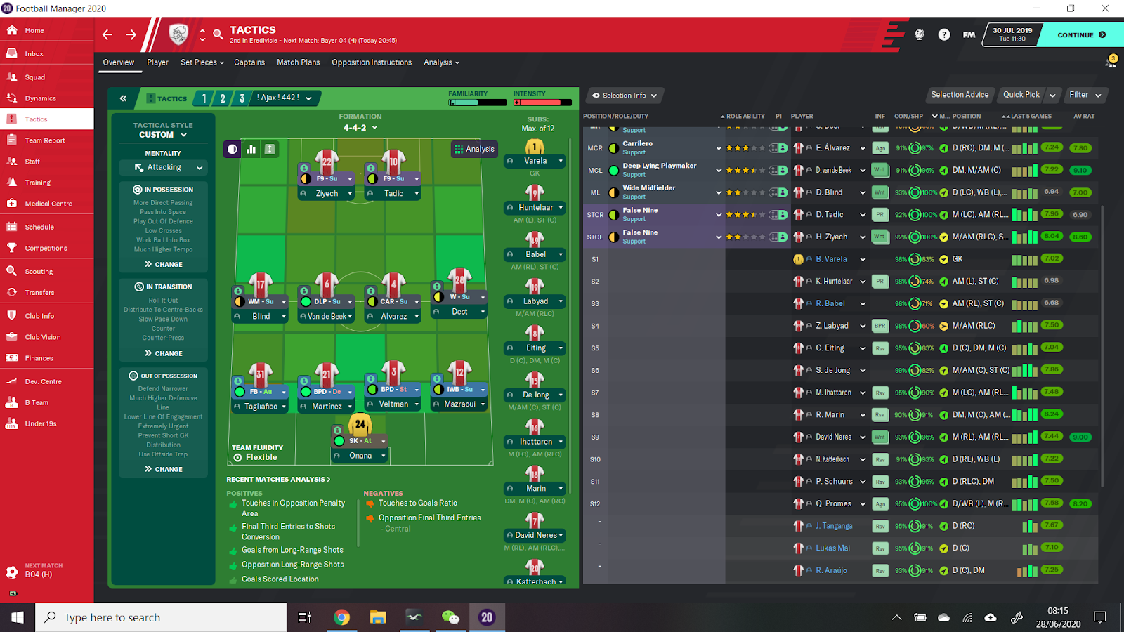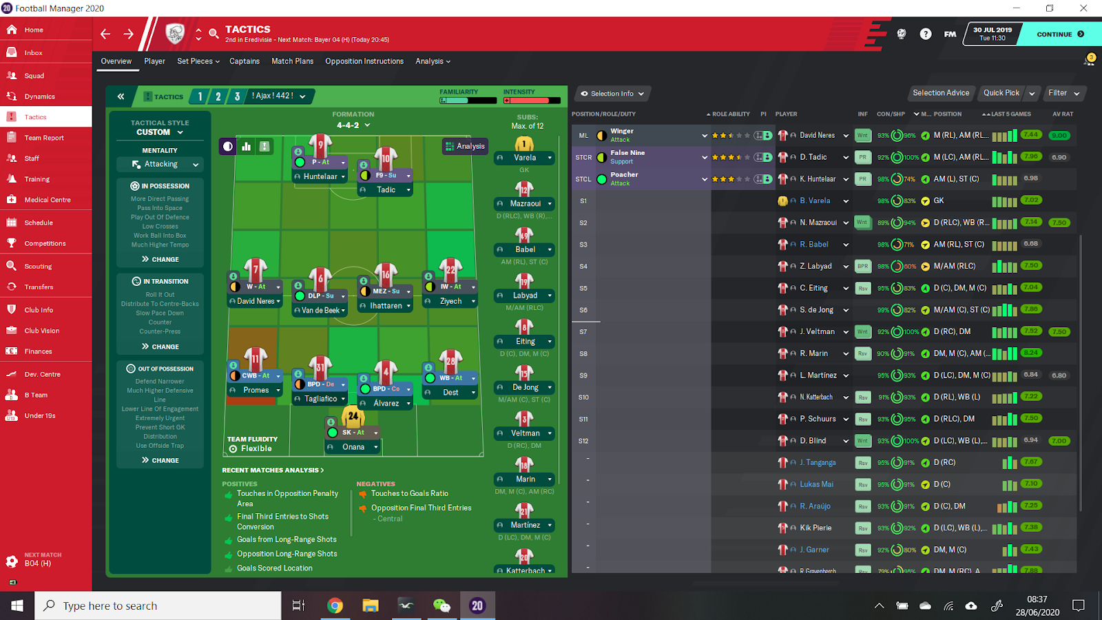AM - Shadow Striker, Attacking Mid, Playmaker - I have 6 players i could play here with Promes and Neres being used as shadow strikers. Neres is being re-trained here and would couple well with a false 9. Ziyech and Ihattaren are suited to the AM role and Tadic/Van de Beek suit the AP role. I like the option to ‘double up’ on each role with shadow striker being a great contrast especially.