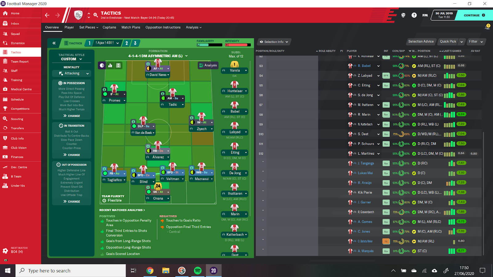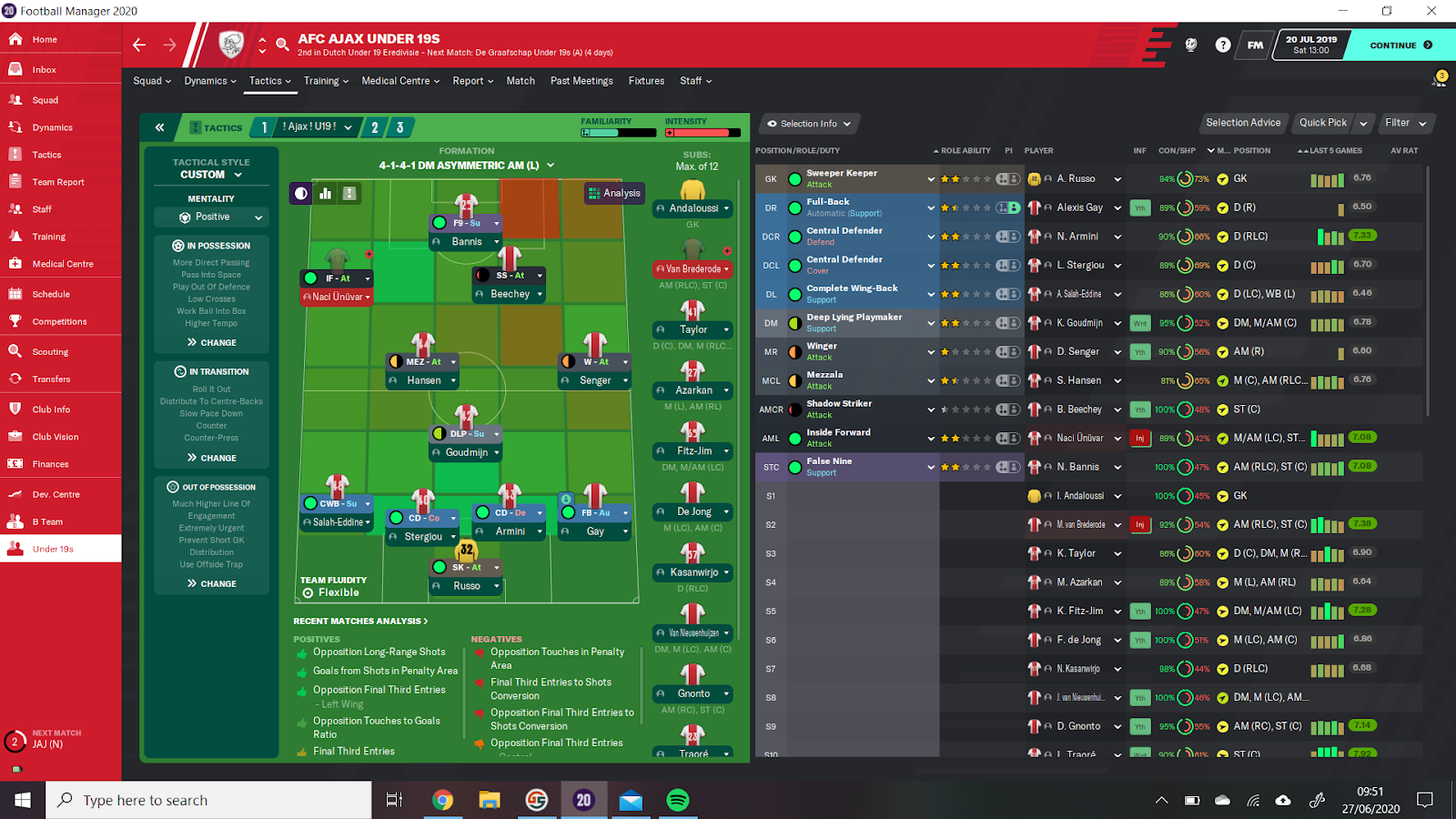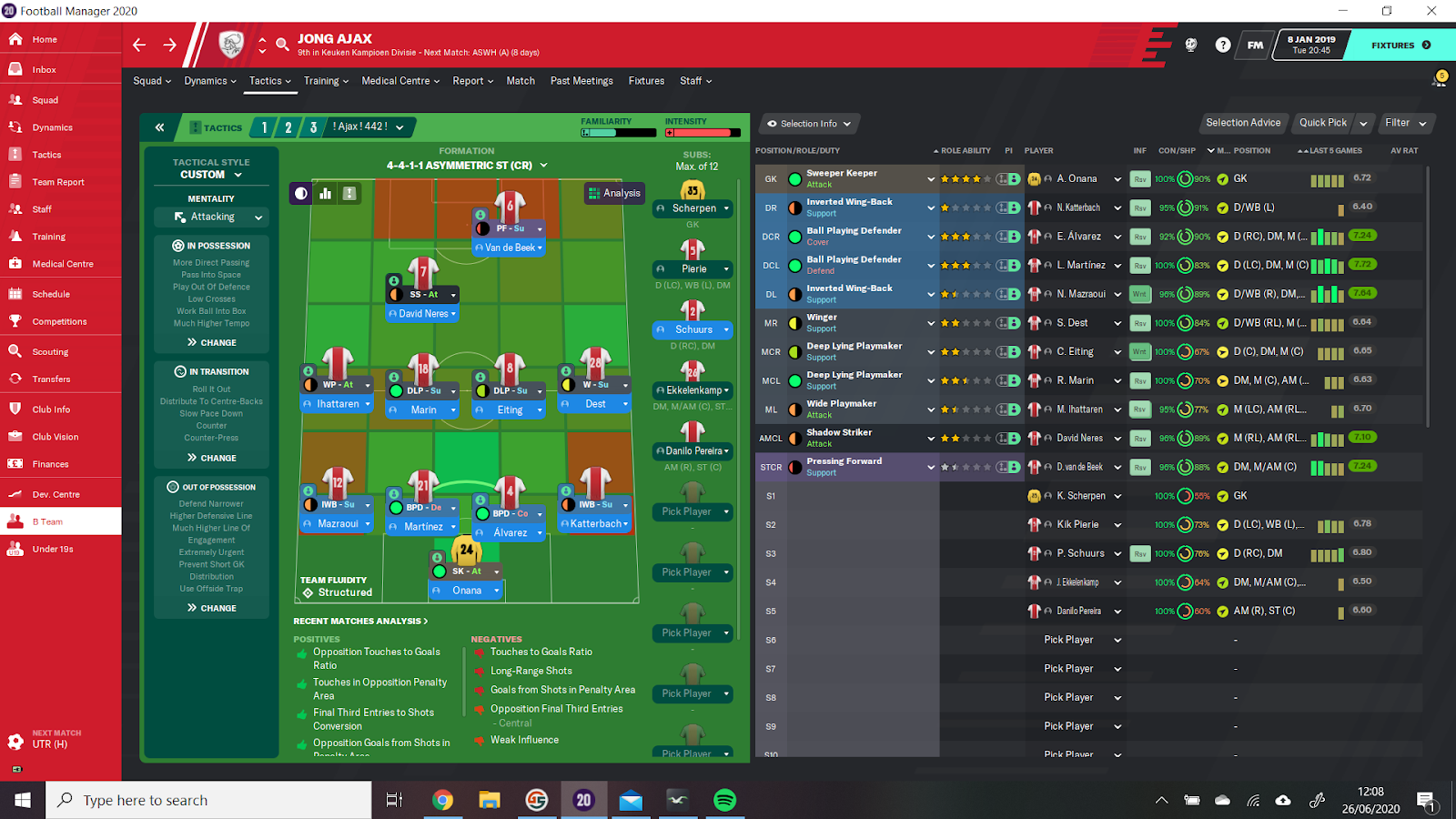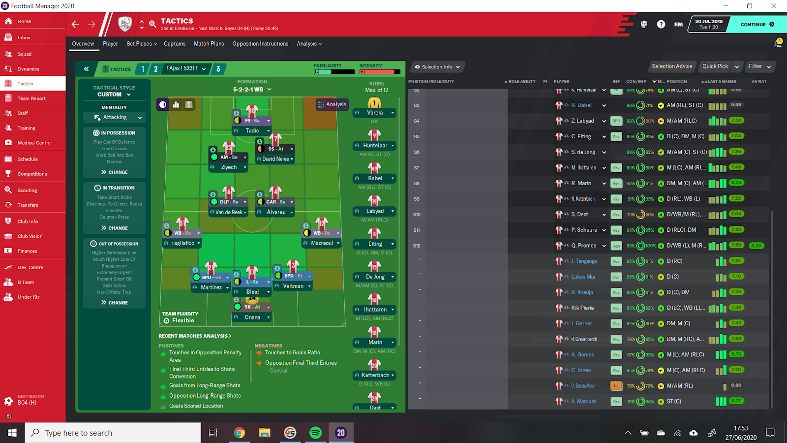 AM - Shadow Striker, Attacking Mid, Playmaker - I have 6 players i could play here with Promes and Neres being used as shadow strikers. Neres is being re-trained here and would couple well with a false 9. Ziyech and Ihattaren are suited to the AM role and Tadic/Van de Beek suit the AP role. I like the option to ‘double up’ on each role with shadow striker being a great contrast especially.