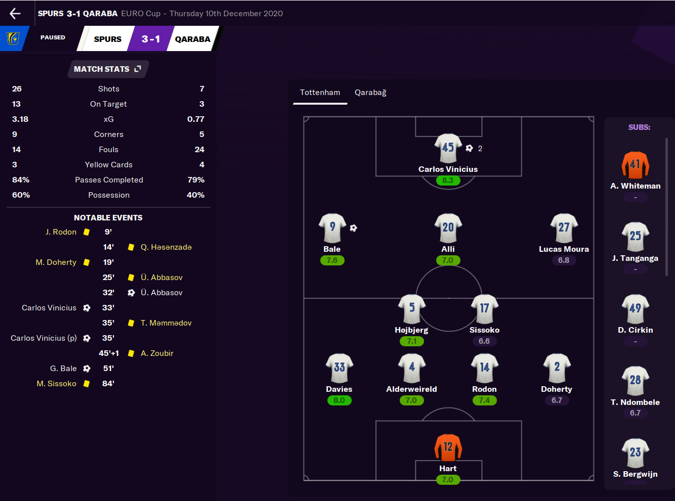 This was more like it. Finally, a f***in’ clean sheet against some s**t opposition. Bergwijn and Vinicius were on the scoresheet, and the result was never in doubt. Fun part about this game was the debut from left-back Dennis Cirkin, who had a very positive first game and kept a clean sheet next to some experienced defenders. Well done lad!
