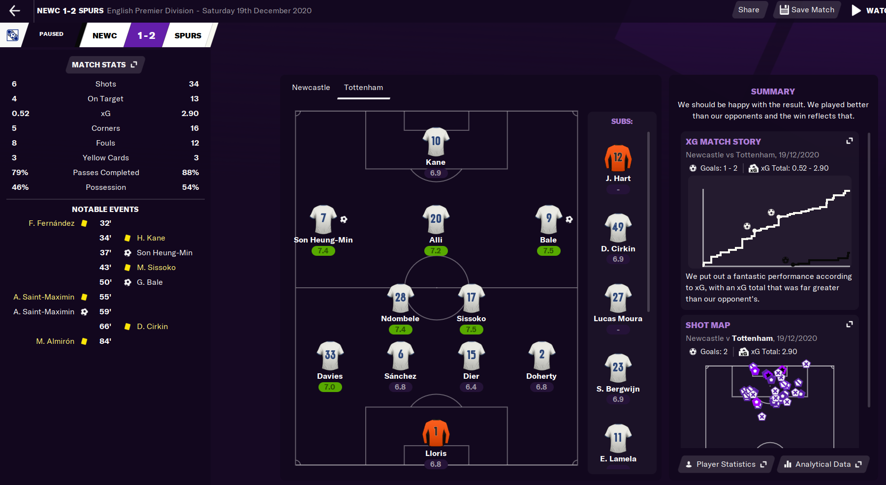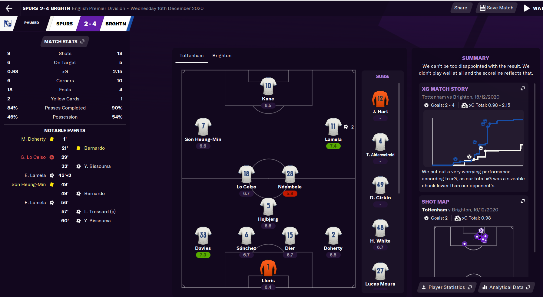 This week, we setup differently. Leeds likes to commit a lot of bodies forward, so the thinking here was to switch to a counter-attacking style. What I am not happy about is that we did not create more chances on the counter. Our xG was down, and we were not breaking with pace. They however, only had one chance early in the game which they scored. From then on, it was a matter of can we take a chance. Alderweireld off a corner, Son off a beautiful counter, and we steal it at the death. Did we deserve it? I think so, their chances were meaningless. While I want to play the most attractive brand we can, we need a mixture of Silk and Steel in our tactics. The Champagne style of Pochettino and the gritty, mud and no glory style of Mourinho. This will bring us glory. Also, it was nice to give Harvey White a debut here.