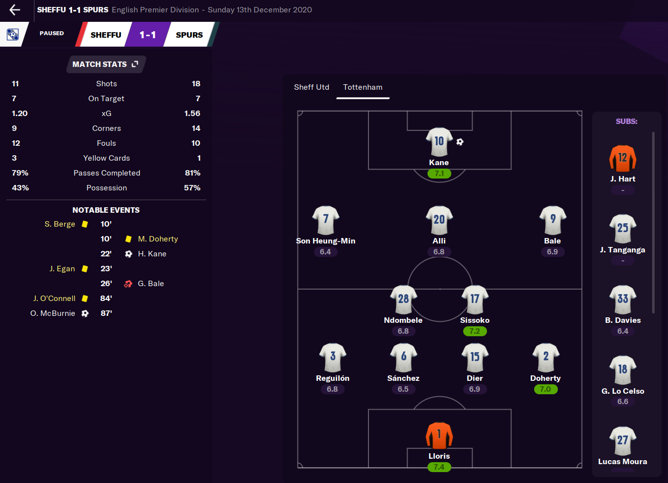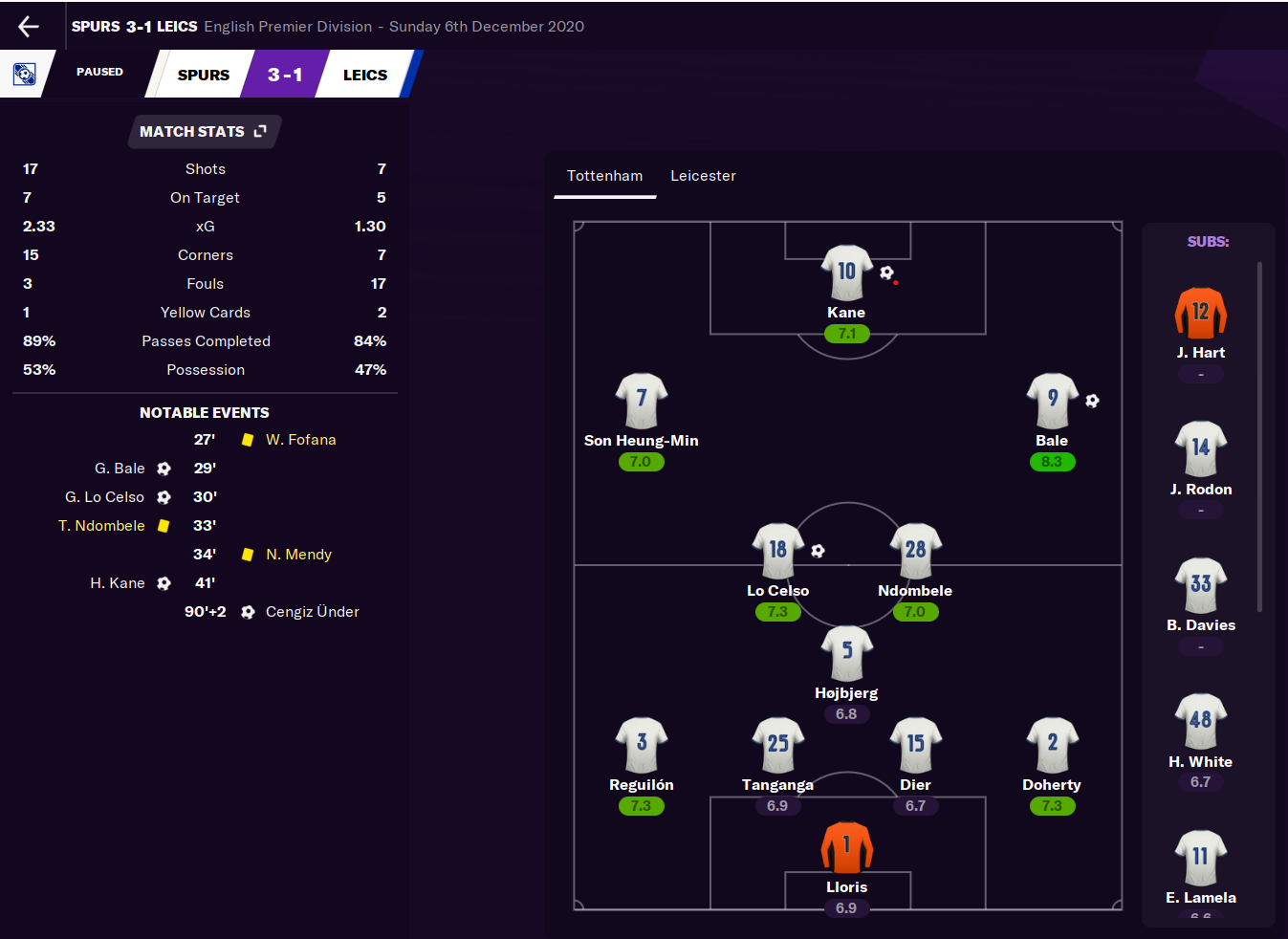 Our forward three has generally been Bale on the right, Son on the left, and Kane as our striking talisman. Kane and Bale in particular have been prolific, Kane scoring 3 and assisting 1, Bale scoring 1 and assisting 3 (solely in the Prem). In cup ties, Bale is getting minutes on the left wing, Moura has been coming in, Lamela has surely impressed as both a sub and a starter, and Bergwijn has had time out on the left. Lamela has been performing better than Moura, and may take his spot as Bale’s backup on the right. Vinicius has done well, scoring in a couple of matches as Kane’s understudy.