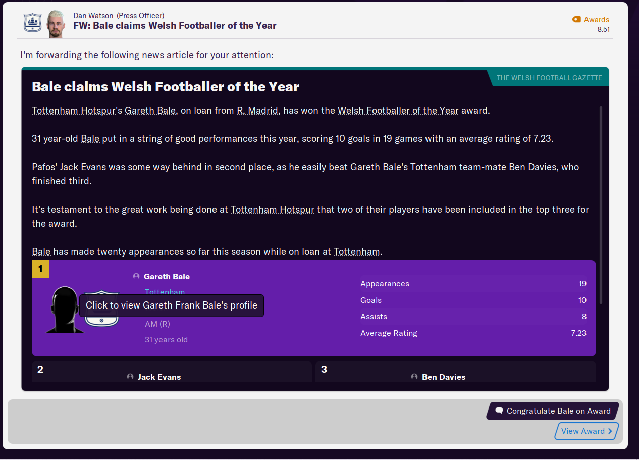 We were pitted against Romanian side Universitatea Craiova (the one and only) and nearly suffered a shocking defeat at home. We started with an experienced side and were completely dominant, but wasted our chances. They scored in the 77th with an easy ball over the top, to put Ofosu one-on-one with the keeper. It was embarrassing defending, and we were spared our blushes with two goals at the death, one by the returning Gareth Bale (two goals in two games ay?) and one from the backup striker Carlos Vinicius. I let the team have it afterwards, but job done.