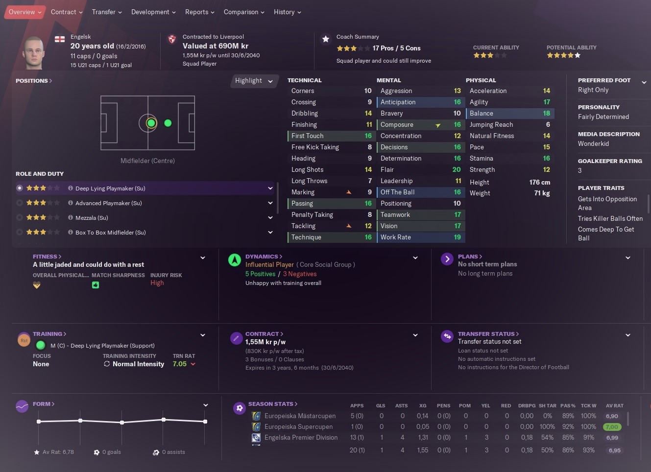 I managed to steal a high potential midfielder several years ago from my rival. He has developed nicely and has spot on attributes to play as a dlp. My problem is that he doesnt seem to get involved in the game as he barley reaches a 6.9 rating in the games. I see him make assist maybe once ever 4th game and when i see his profile he should be able to do much more. I tried changing the role for him on the central midfield and still get same results.. what should i do?