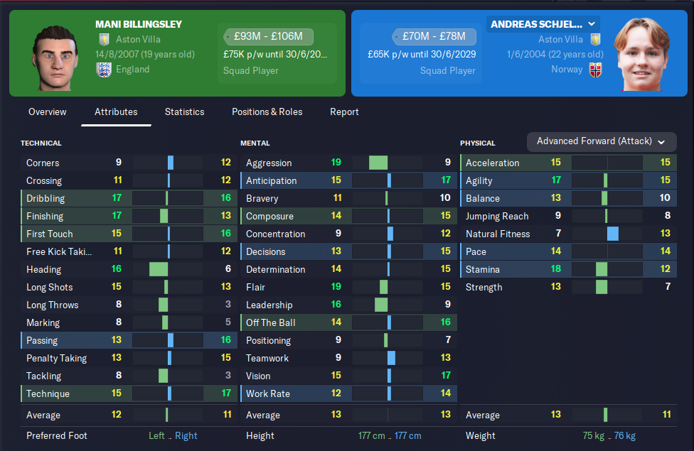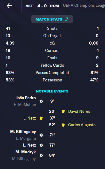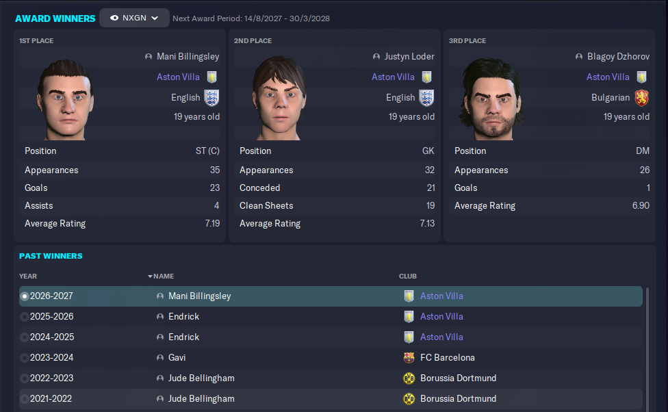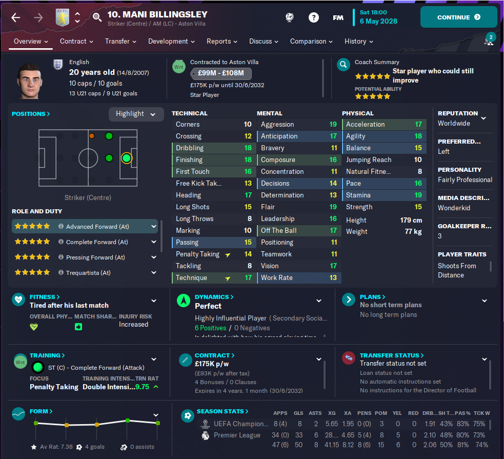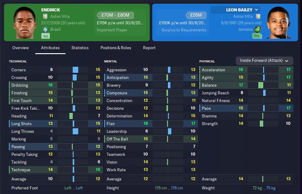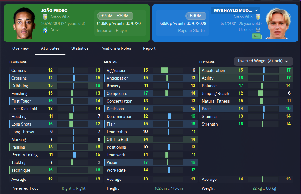 The main attacking threat from our team comes from the youngsters Billingsley and Endrick. At times, I've deployed them as striker partners up-front but I think that despite his great attributes, Endrick is better suited for AMR position as an IF (A). João Pedro was my 2nd signing with Aston Villa and while he hasn't been able to take the number 9 role to himsellf as I originally planned, he has transformed into attacking wide player, who has been good for 10 league goals and assists in his past two seasons, which is not insignificant. And this is all after posting an avg rating of over 7.00 in 3/4 seasons.