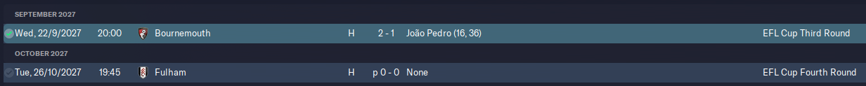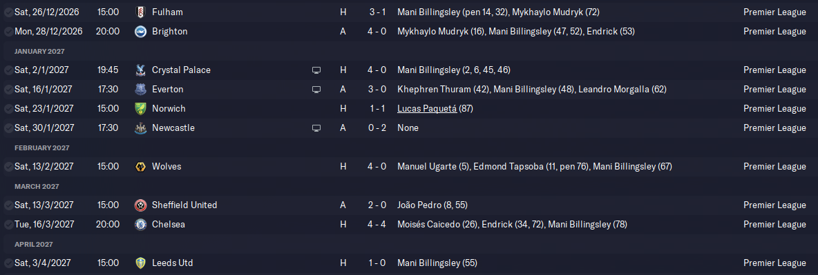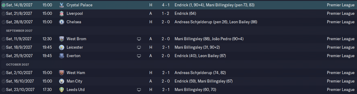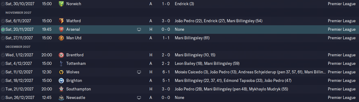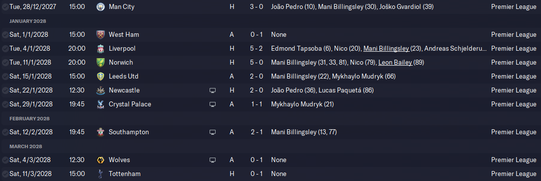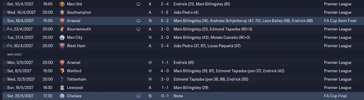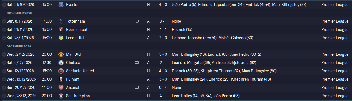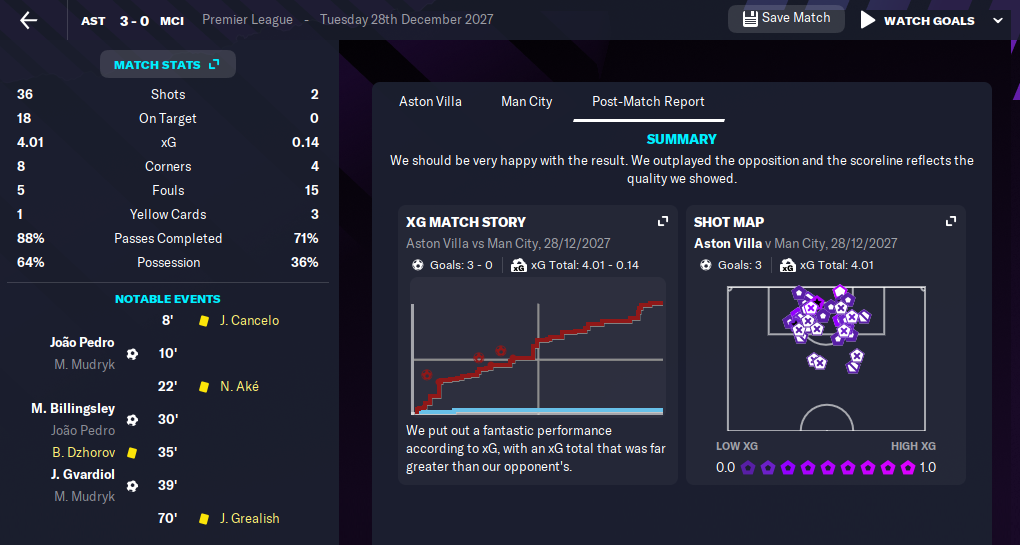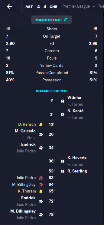 The main attacking threat from our team comes from the youngsters Billingsley and Endrick. At times, I've deployed them as striker partners up-front but I think that despite his great attributes, Endrick is better suited for AMR position as an IF (A). João Pedro was my 2nd signing with Aston Villa and while he hasn't been able to take the number 9 role to himsellf as I originally planned, he has transformed into attacking wide player, who has been good for 10 league goals and assists in his past two seasons, which is not insignificant. And this is all after posting an avg rating of over 7.00 in 3/4 seasons.