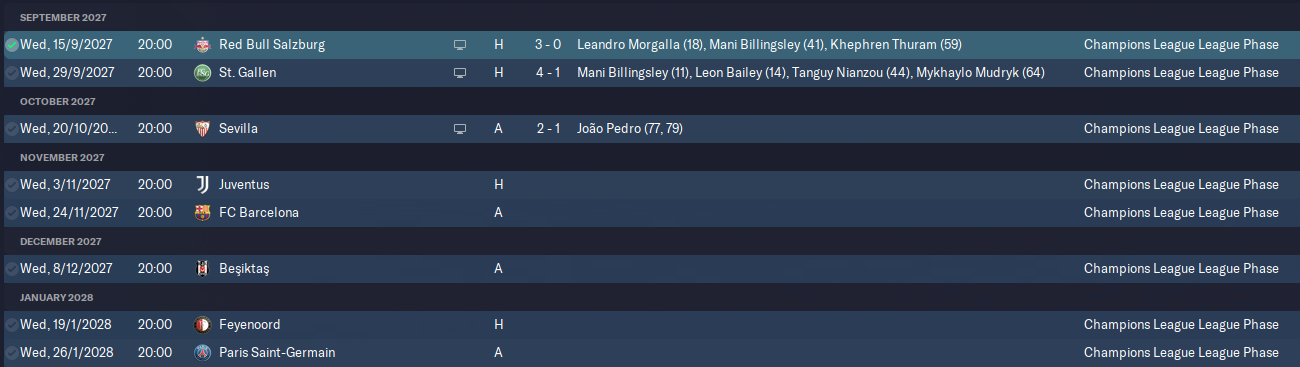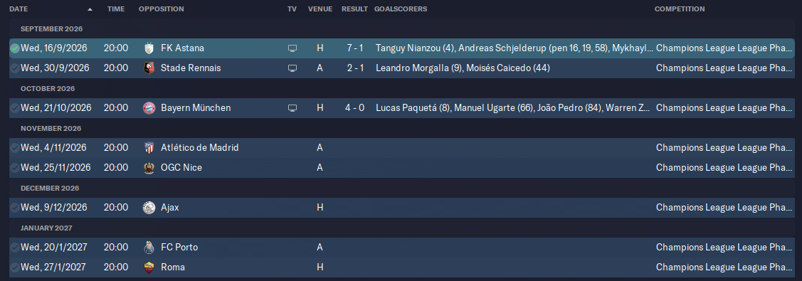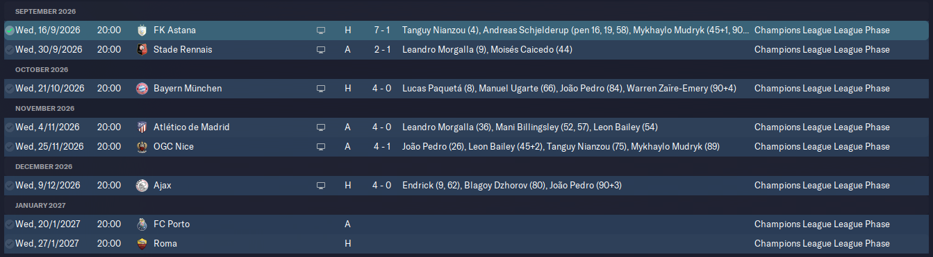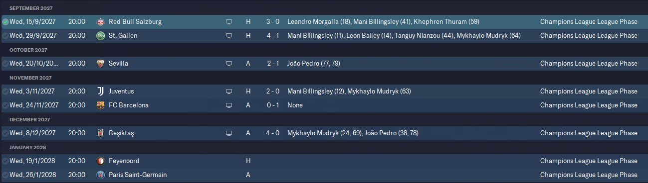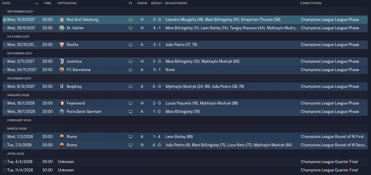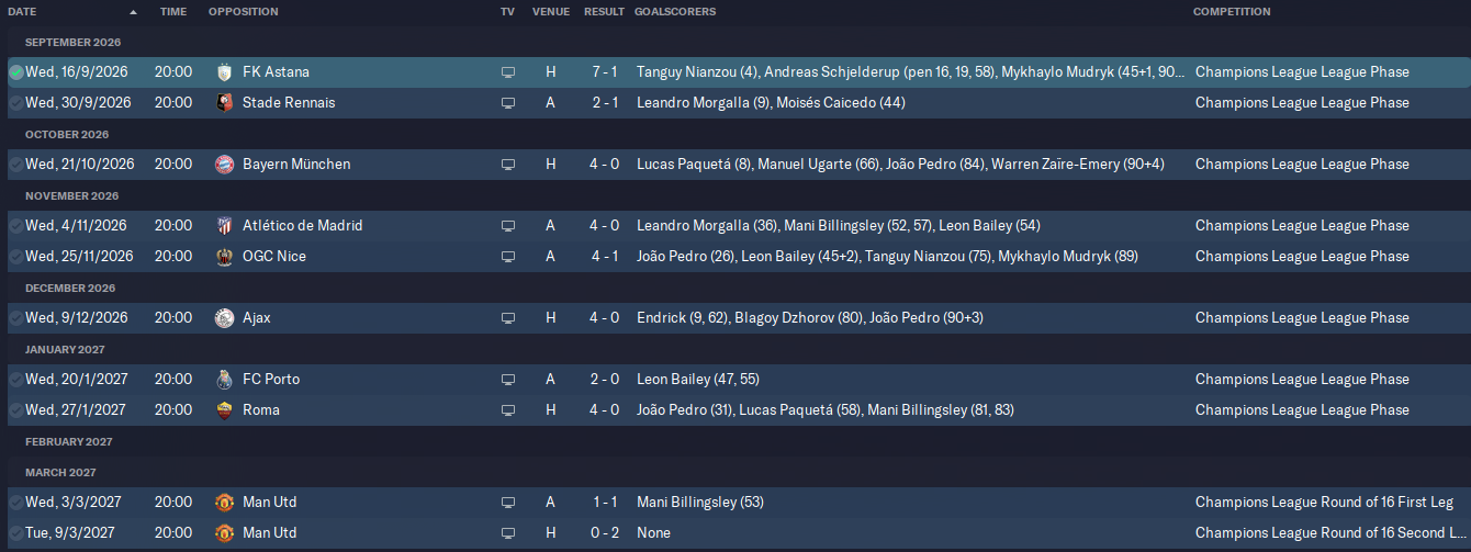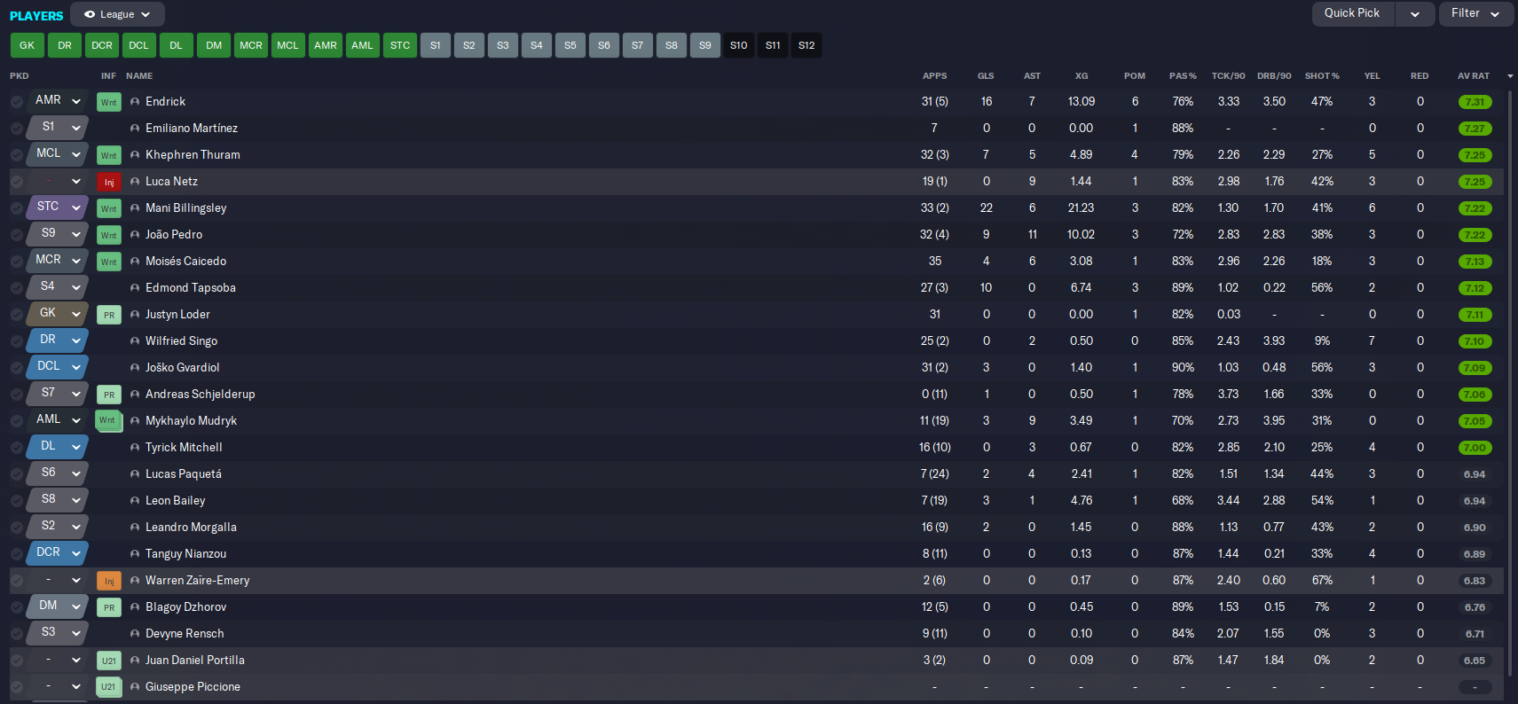 I spoke about Caicedo and his energy above. He feels like an older player in our young team but with only 24 years of age he is still developing player himself. The BWM (S) role allows him some freedom and with his great mental attributes he knows how to best support the team. Khephren Thuram has been the unsung hero of the story as he was signed on my 2nd season for just £14m to offer some competition for places. He has an avg rating of above 7.00 in his first three seasons and he is truly a great player whose excellent physical attributes are supported by his equally great technical and mental skills. Manuel Ugarte offers a solid base for the midfield as an Anchor. To be fair he is perhaps the first player in our starting XI who could be replaced but he is a great defensive mifdielder nevertheless.