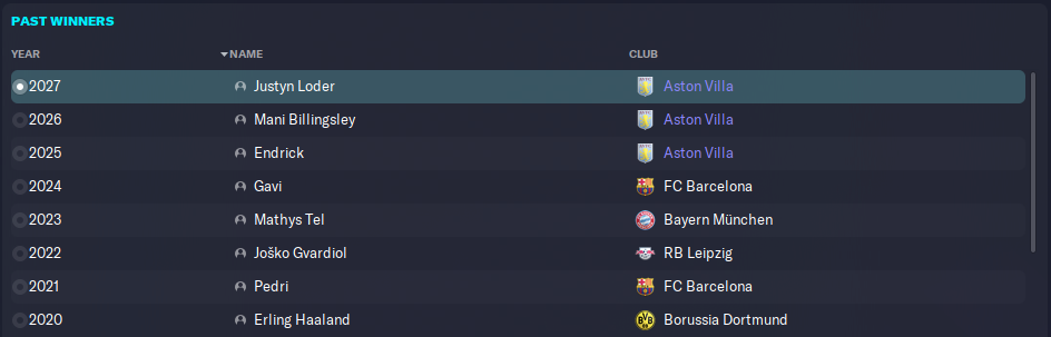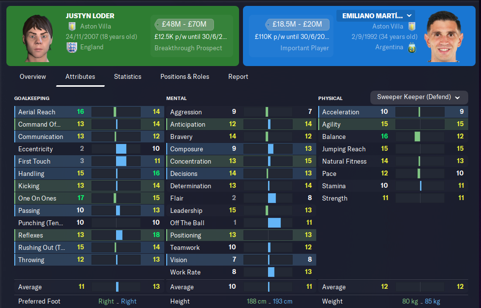 Last but not least let's look at our goalkeepers. Emiliano Martinez has been our starting goalkeeper more or less for my whole managerial career. His avg ratings for season have been between 6.96 and 7.04, so he has been good for us. However, at the age of 34 we need to have some continuity plan and that plan is Justyn Loder, who has been given the starting role at the beginning of my 5th season with Aston Villa. As Loder isn't as comfortable with the ball on his feet as I'd like him to be, the GK role is currently set at SK (S) instead of (A)