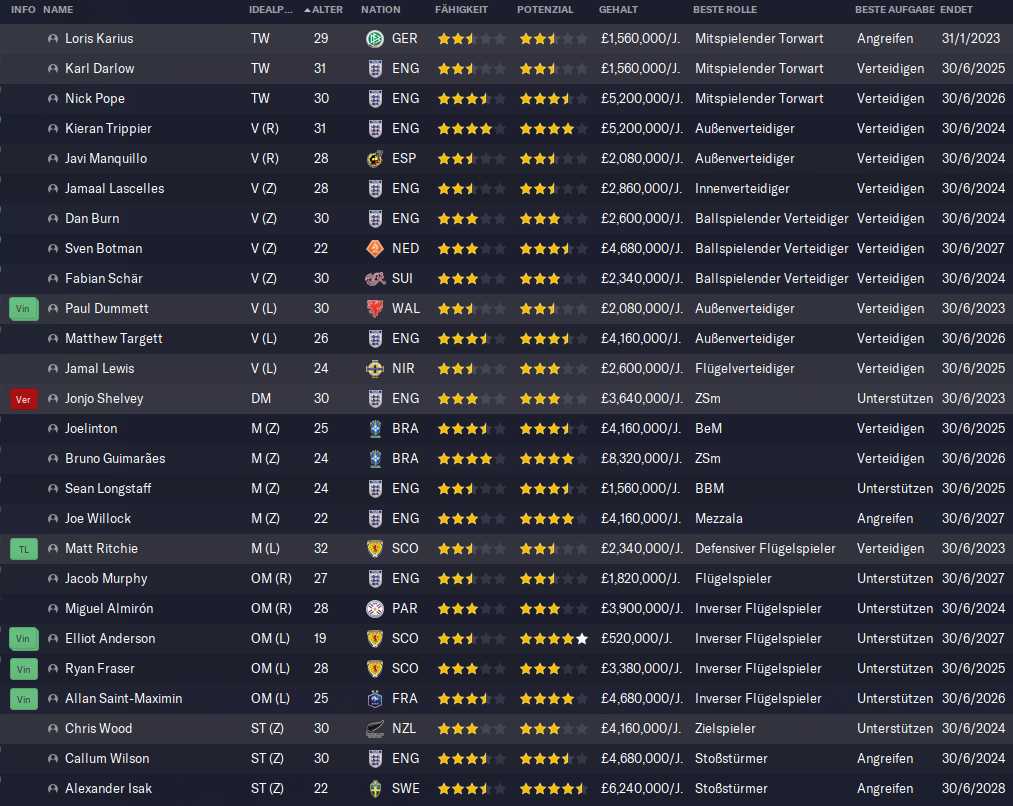 A first look at the squad shows that there is some quality in our rows. With Alexander Isak and Elliot Anderson there are also two players which can go all the way to the top. It will be key that we bring out the best of our top players like Bruno Guimaraes, Alexander Isak, Allan Saint-Maximin, Kieran Trippier and Miggy Almiron.