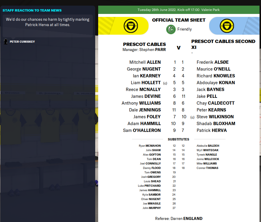 After I got changed I met Peter Cumiskey. Assistant Manager. We decided to not to chance the captain just yet. However some of my coached believe that Veteran John Shaw would be better than Liam Hollett. We don't have a vice captain yet. So I may use John that way. My team has a few names who have League two experience. Adam hamill. Sam O'Halleron and Dale Jennings. A few of those played for Fleetwood and Tranmere Rovers.