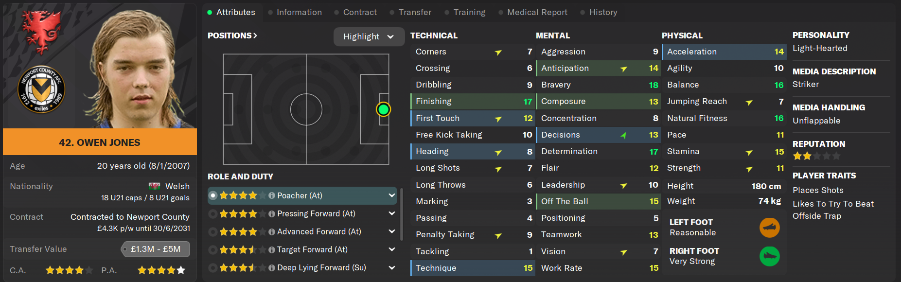 The most valuable player at the club and a growing Welsh football icon, Owen Jones has developed steadily since joining as an 18 year old from Barry Town and will now be expected to drag Newport County to survival at the tender age of 20. A pure poacher in every sense of the word, Jones only needs a split second chance to score with his deadly accurate right foot. He's a deceptively hard worker too despite his laconic appearance.