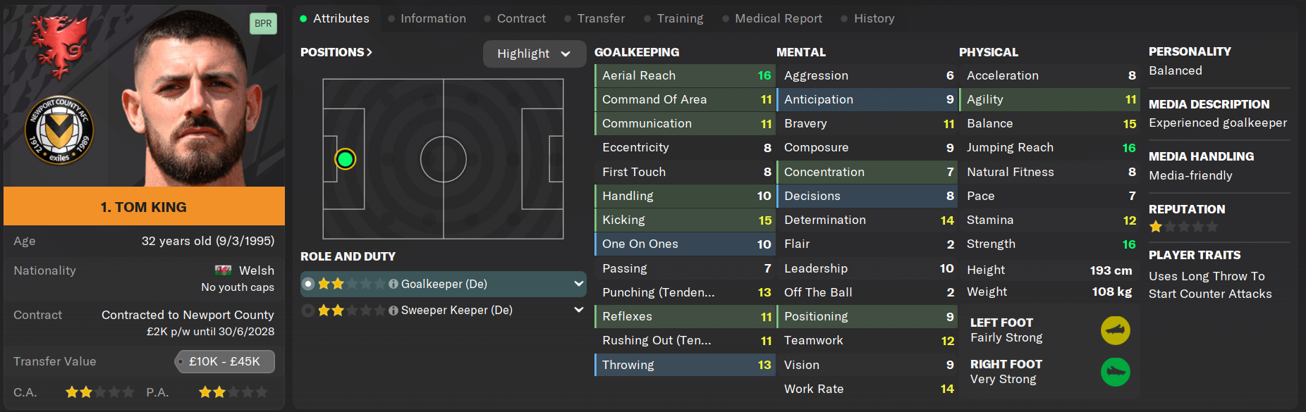 Tom King has been a first team goalkeeper at the club across two separate stints, and was brought back from Salford City ahead of Montgomery's second season at the club to replace the departing Joe Day. After starting strongly in his first campaign, defensive frailties began to expose King's abilities more frequently and he was replaced by Lewis Thomas as the first choice goalkeeper last season. King continues to provide experience and leadership around the dressing room and has become the designated cup goalkeeper.