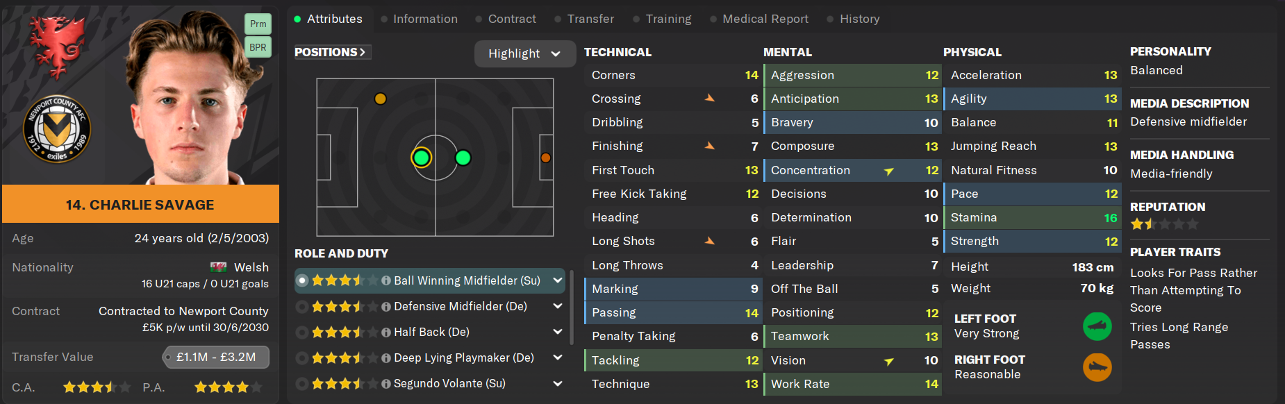 Much like his dad Robbie, Charlie Savage is a tenacious and hard-working midfielder who has put in shifts from box-to-box ever since joining the club permanently two years ago. After some early injury troubles, he's become one of the first names on the team sheet and is being monitored closely by Wales manager Rob Page for a potential call-up.