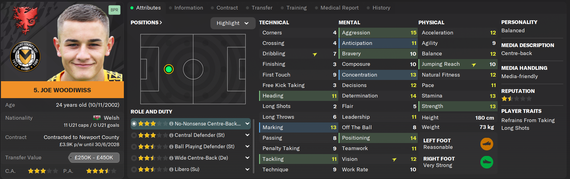 Joe Woodiwiss's development was fast tracked from Hugo Montgomery's first season and the decision has paid dividends with the now 24-year old forming one half of League One's best centre back pairing last season. He now has over 150 appearances for the club and was called up to Wales' preliminary squad for the 2026 World Cup last year, indicating that a strong season at Championship level should see him break into the senior set-up.