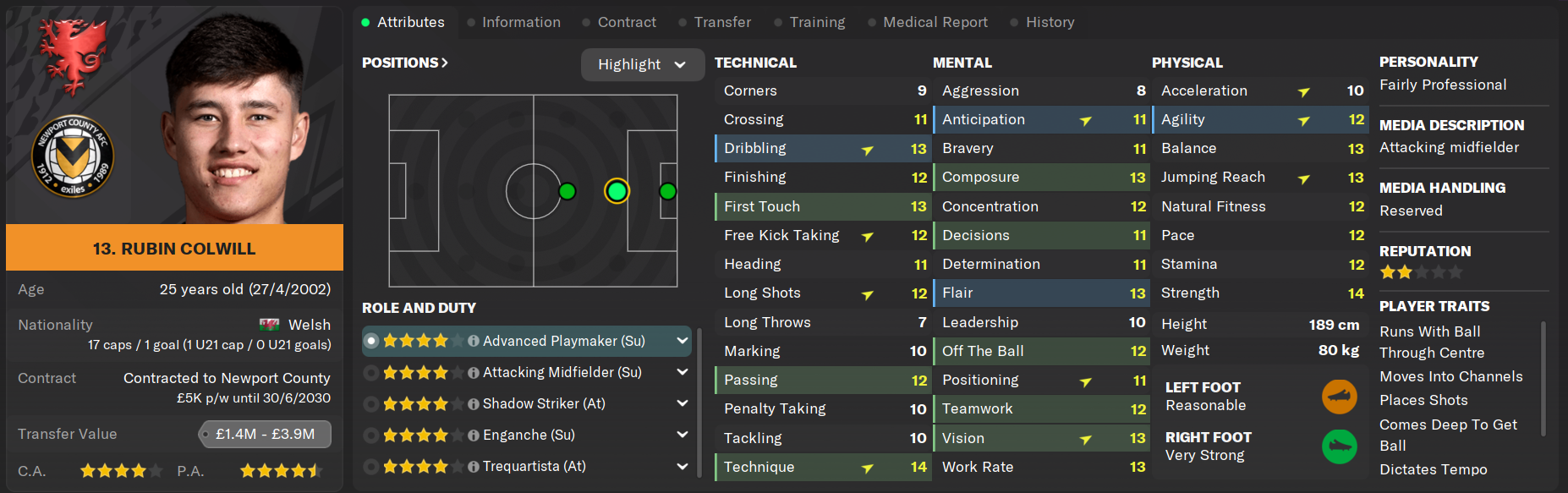 Rubin Colwill has more experience at Championship level than any other player in the squad which is why he was so highly sought after as a free transfer target. The ex-Cardiff player possesess a well-rounded game and can leave his imprint on games in an attacking midfield role, where he is set to feature heavily for Newport County.