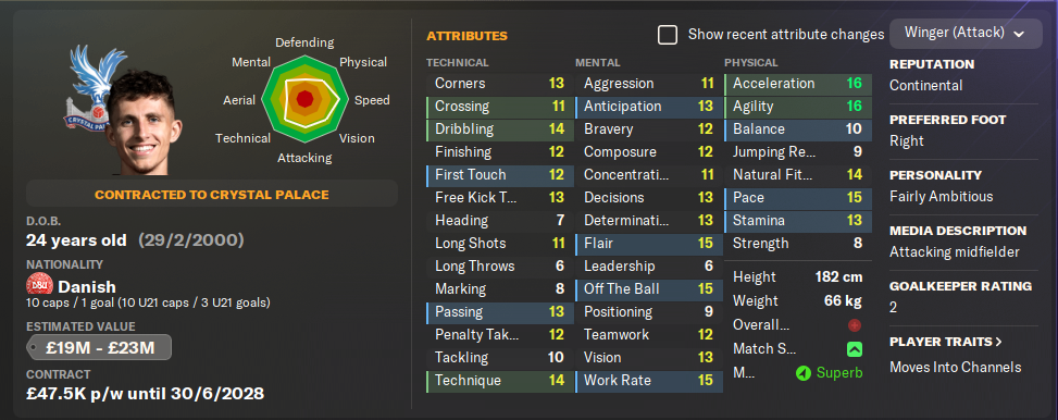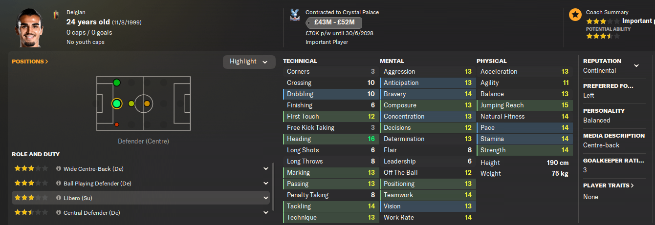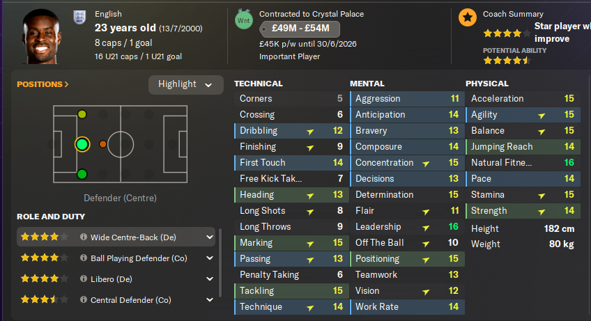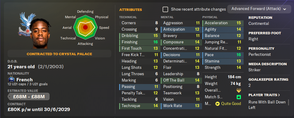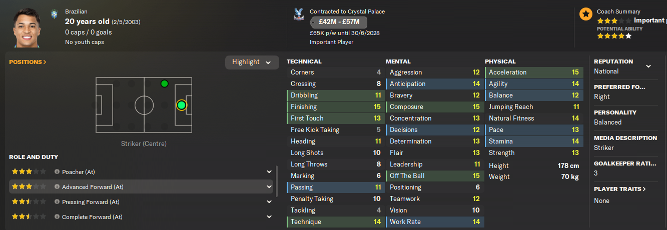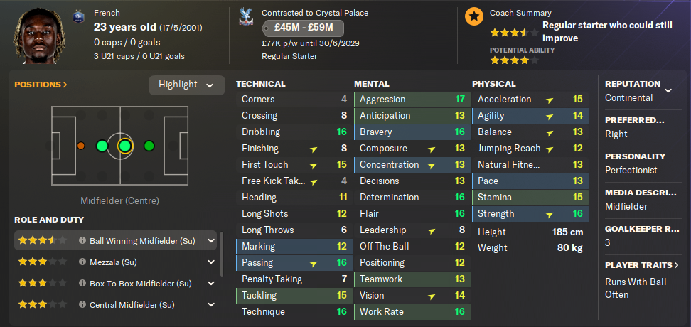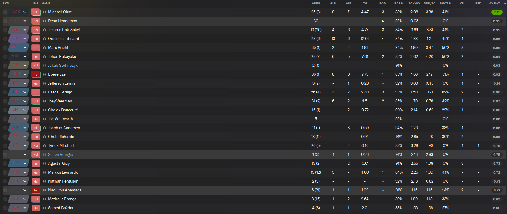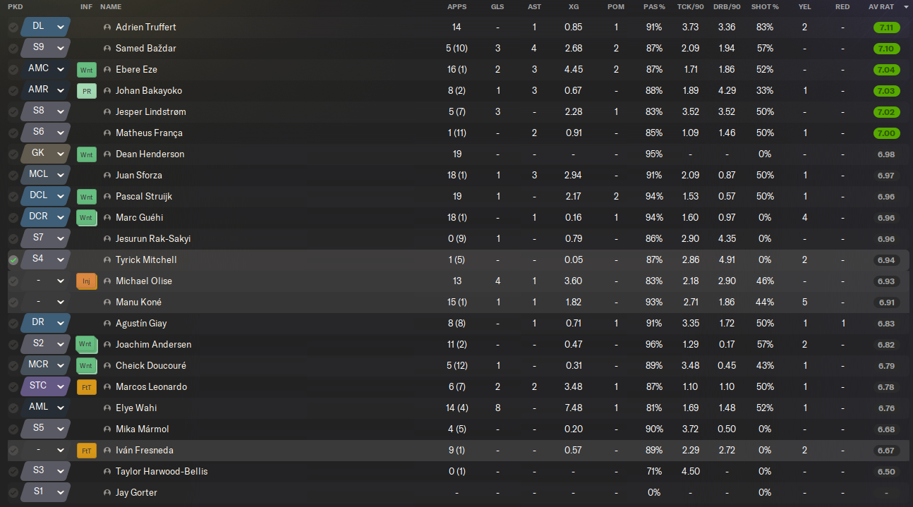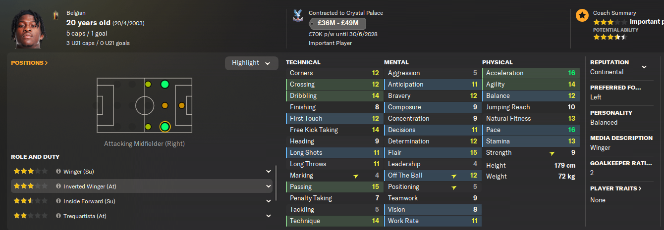 Simply put, he is our best player. The 24-year-old Englishman possesses the technical abilities of Olise but is a more well-rounded player. With relatively high attributes in finishing and long shots, we’ll need him to score some goals as well, while Olise leans more towards being a creator.