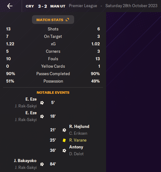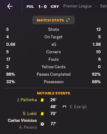 I believe Crystal Palace F.C. is a football club that has been a victim of an excessively competitive environment. At times, they have attempted to evolve, but these efforts have, so far, failed, leading them to become a risk-averse club. They have sacrificed enjoyment in order to maintain their status as a Premier League club. Their season goal is not a title or European qualification, but simply securing a position in the lower half of the league table. They are not playing for fun; they are performing to achieve their goal of avoiding relegation battle and continue the same cycle next season.