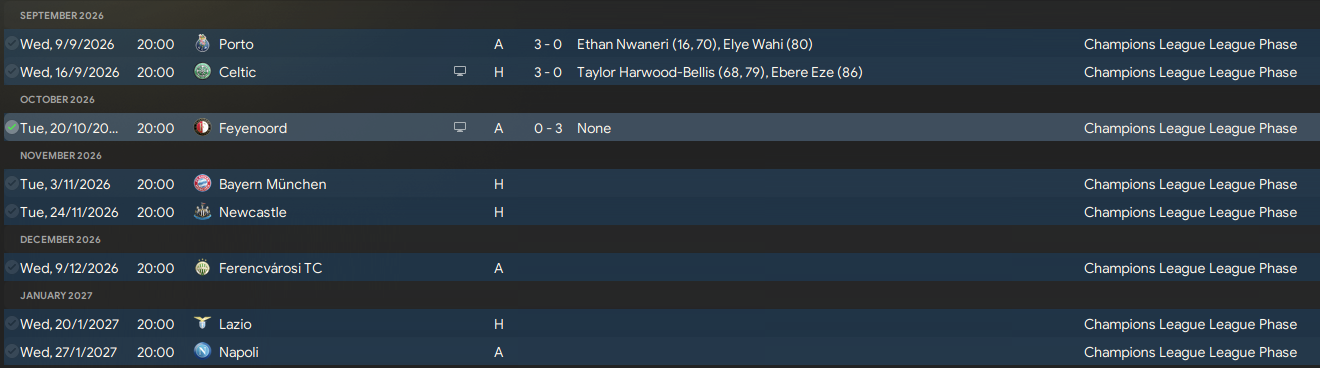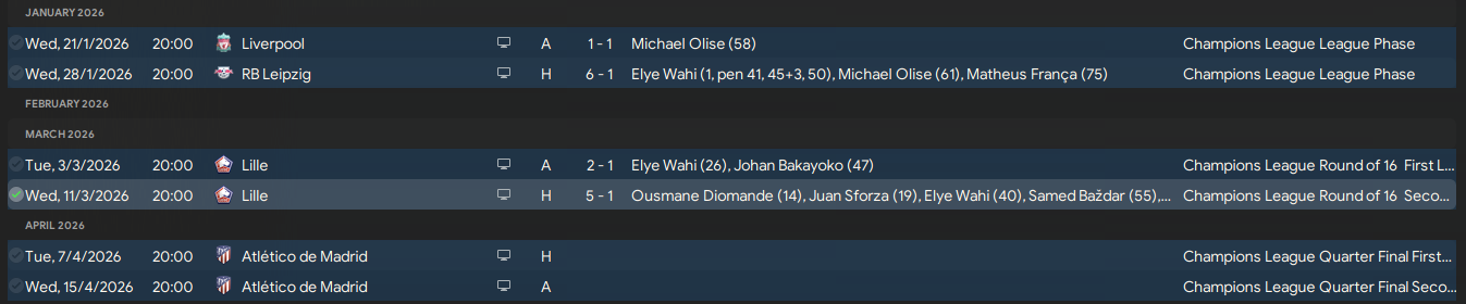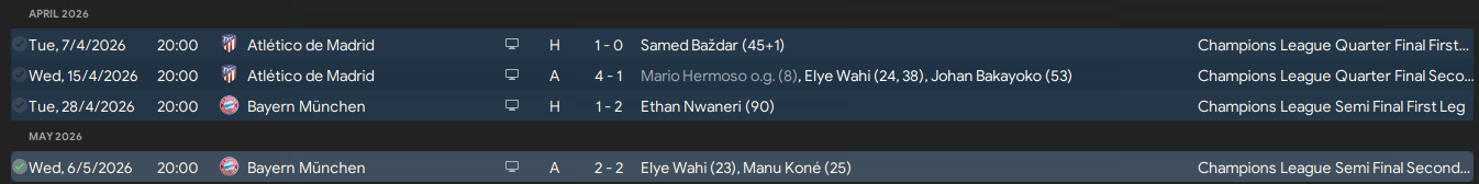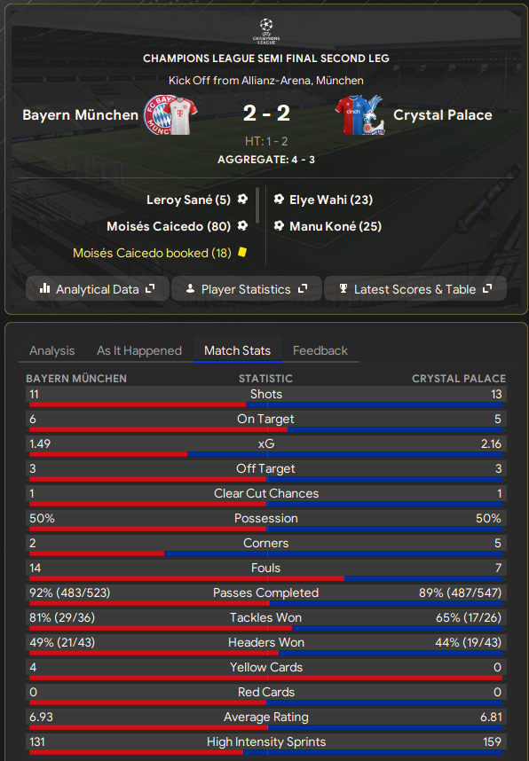 The quarter-finals pitted us against Ajax. Starting at Selhurst Park, we took an early 2-0 lead within 8 minutes, putting us in a strong position to advance further in the European journey. We scored another goal in our home game and left the Johan Cruyff Arena with a 2-0 victory firmly secured. Over the matchup we were clearly the better side and quite dominantly so.
