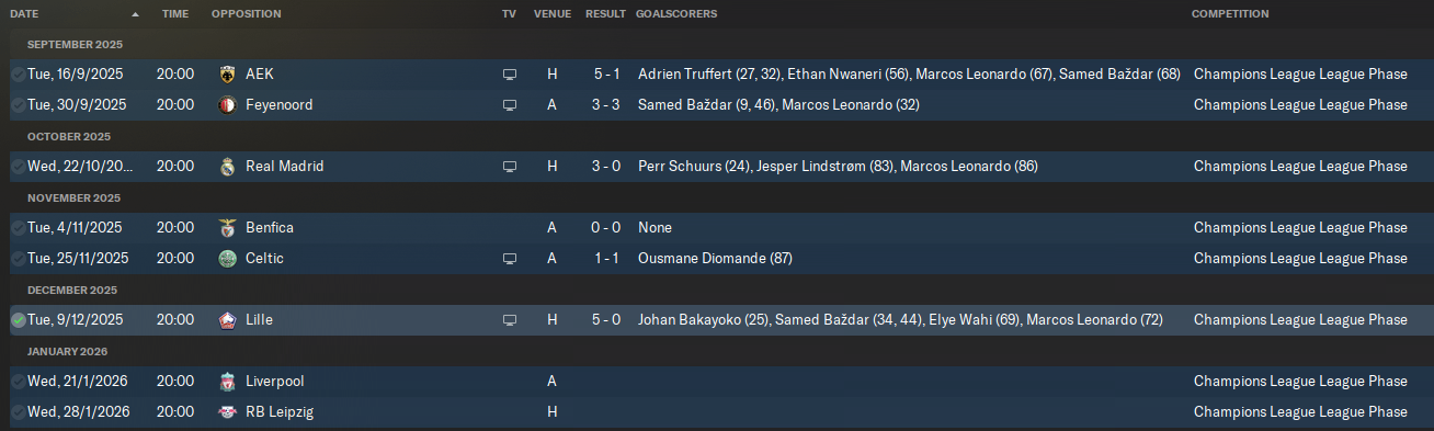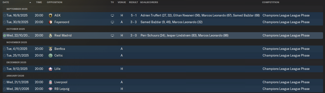As mentioned, we progressed to the knockout stage after winning the League Phase with a record of 7-1-0, with the only draw coming against AC Milan, a team considered European giants due to their history in the UCL.