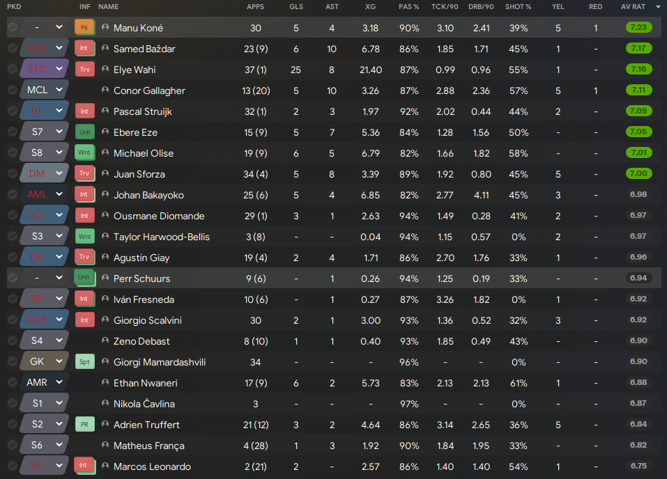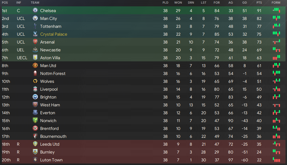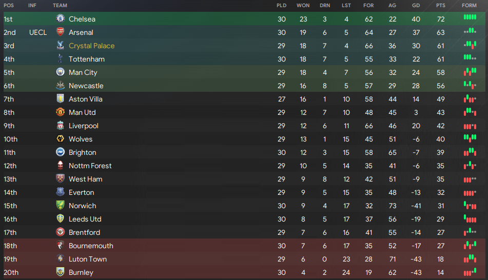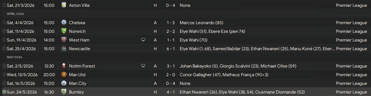 We ended the last update in decent form, and I'm pleased to report that it continued. Winning our next three PL games essentially secured us the 5th position, which is highly likely to guarantee a UCL qualification spot. Due to fixture congestion and some bad luck, we couldn't secure wins in the following three matches. However, we managed to regain our momentum and finished the season with three consecutive victories in the league.