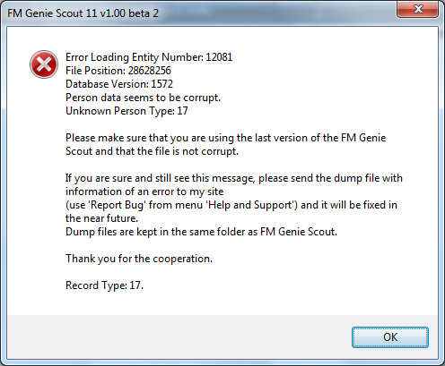Actually, it's impossible to start FM Genie Scout. When I load a party i've the message "Invalid Argument to date encode" and i can't do something.