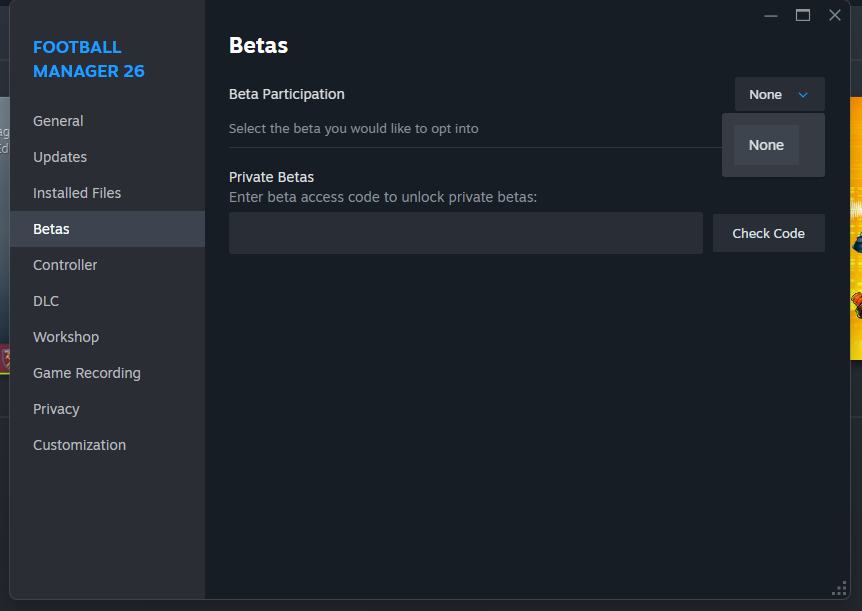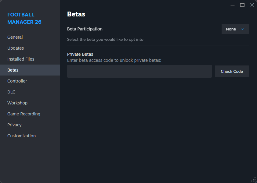 • In Steam Library, right-click on Football Manager 26 -> Properties -> Betas