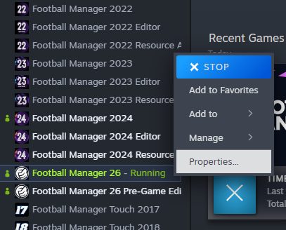1. Locate Football Manager 26 in the games list of your Steam Library, right-click on it and select Properties.