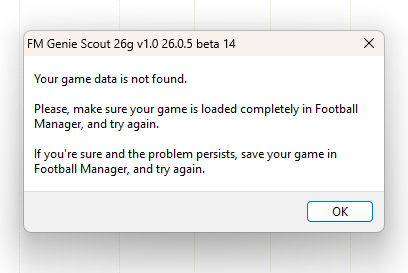 - Make sure to have FM26 open and a game loaded there. (Done - doesn't work)