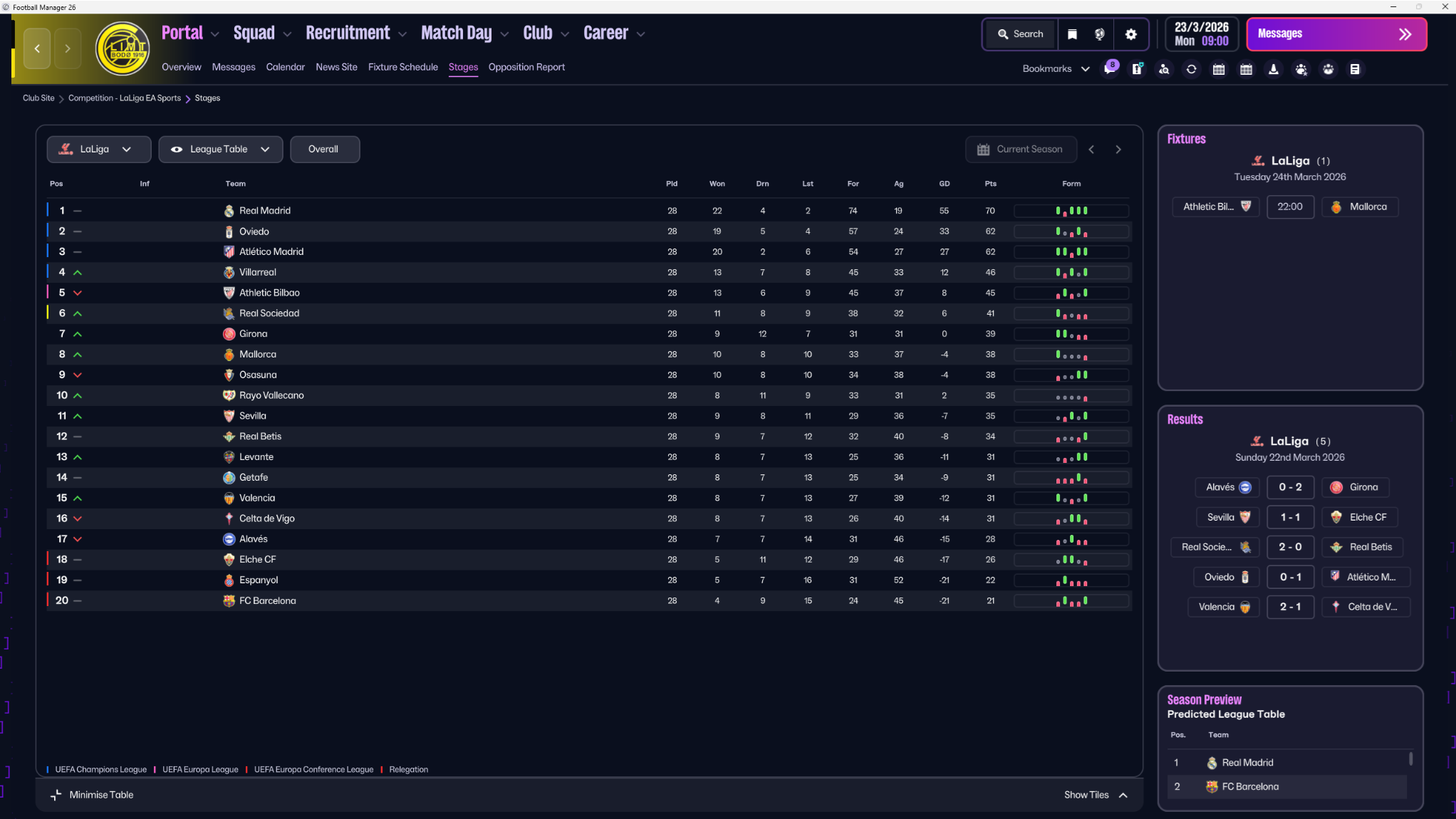 2. League table (at least one season for all teams mentioned in the test) – this is because some users in the past showed a results table with an average team and then a cup competition view where they won quadruples with big teams – this was misleading