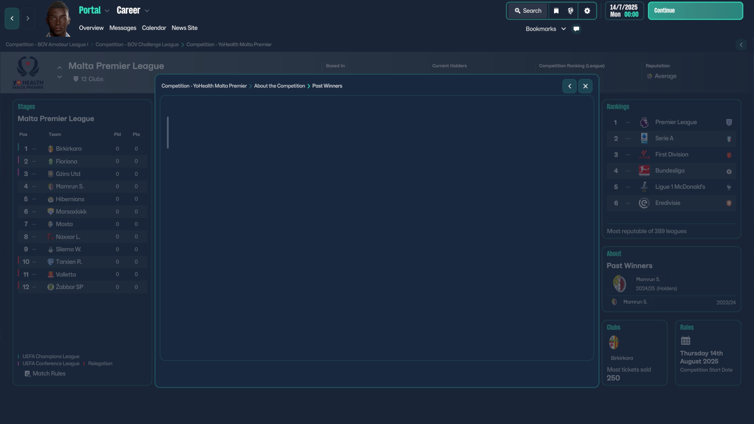 I created the Maltese league on the pre-game editor, but when I load the game and go to the top division → Past Winners, the preview shows correctly. However, when I click on it, the list is empty, and even if I simulate several years nothing appears. The other divisions are working normally.