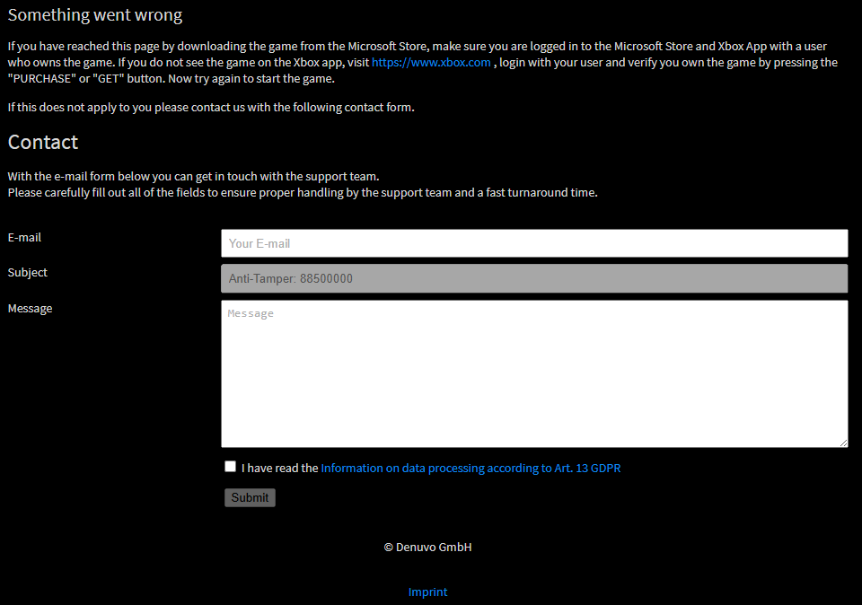 Since yesterday's Game Pass update, the game keeps freezing on the loading screen. I keep getting this message, and it seems to be related to Denuvo, since the link takes me to a support page asking me to send a message with the subject "Anti-Tamper: 88500000". I've tried everything to solve this, but the error persists. I saw some people saying that waiting 24 hours would solve the problem, but I waited longer than that and nothing changed. Honestly, I don't know what else to do.