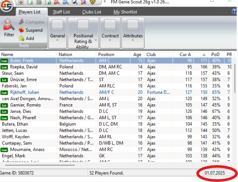 Hopefully in screen shot you can see game date shows as 1st july 2025 but in game is 03/08/2027. Freek Buter, first player in screenshot list shows as aged 15 but is 17 ingame.
