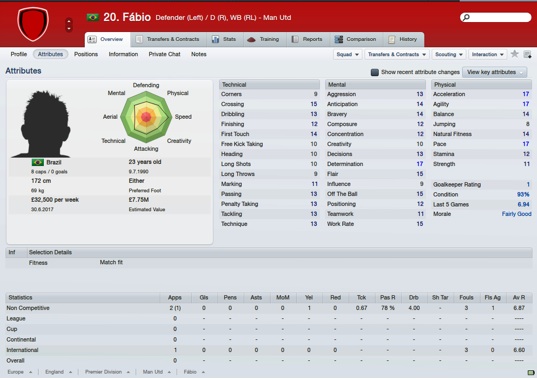 #39353 Ory1997 : What happened to Ronney? Btw could you show me the development of these guys in the attributes page: Fabio, Rafael, Chris Smalling, Phil Jones, Javier Hernandez, Eden Hazard and Progba. I always have serious problems developing Fabio and Rafael in my game and always eventually sell them, Progba never develops even if I play him a lot, 15(10) games per season for him. Jones and Chris Smalling seem to stop developing in my games at around 22-24 just before thier stats develop into world class. As for Hernandez and Hazard I'm just curious.