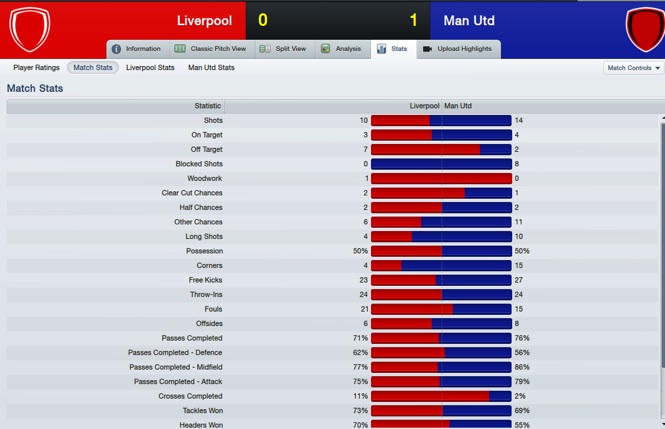A very high tempoed game with lost of cards for both teams. Liverpool had Jagielka and Yarmolenko booked plus Sissoko and Suárez sent off for two bookable offences and United had Vidić, Bale, Pogba, Hazard, Götze, Rooney and Fábio booked plus Hernández given a straight red card.