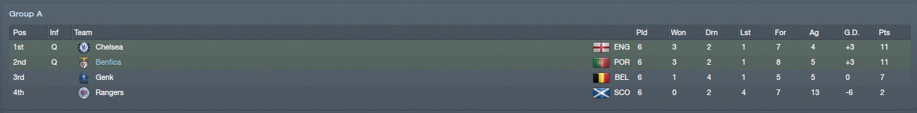 Benfica came in second with the same points as Group A leaders Chelsea, but losing out on direct confrontation. It was a tough group for everyone, with Genk being a thorn on the side of both Chelsea and Benfica. Genk will now follow to Europa League and Rangers are out of the European competitions for this year.