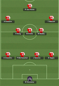 Line Up: W Szczensny Cissokho P.Mertesacker T.Vermaelen B.Sagna A.Song Arteta A.Arshavin Walcott Van Persie Chamakh