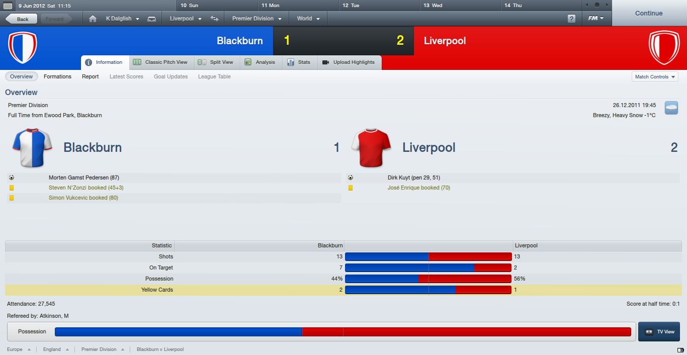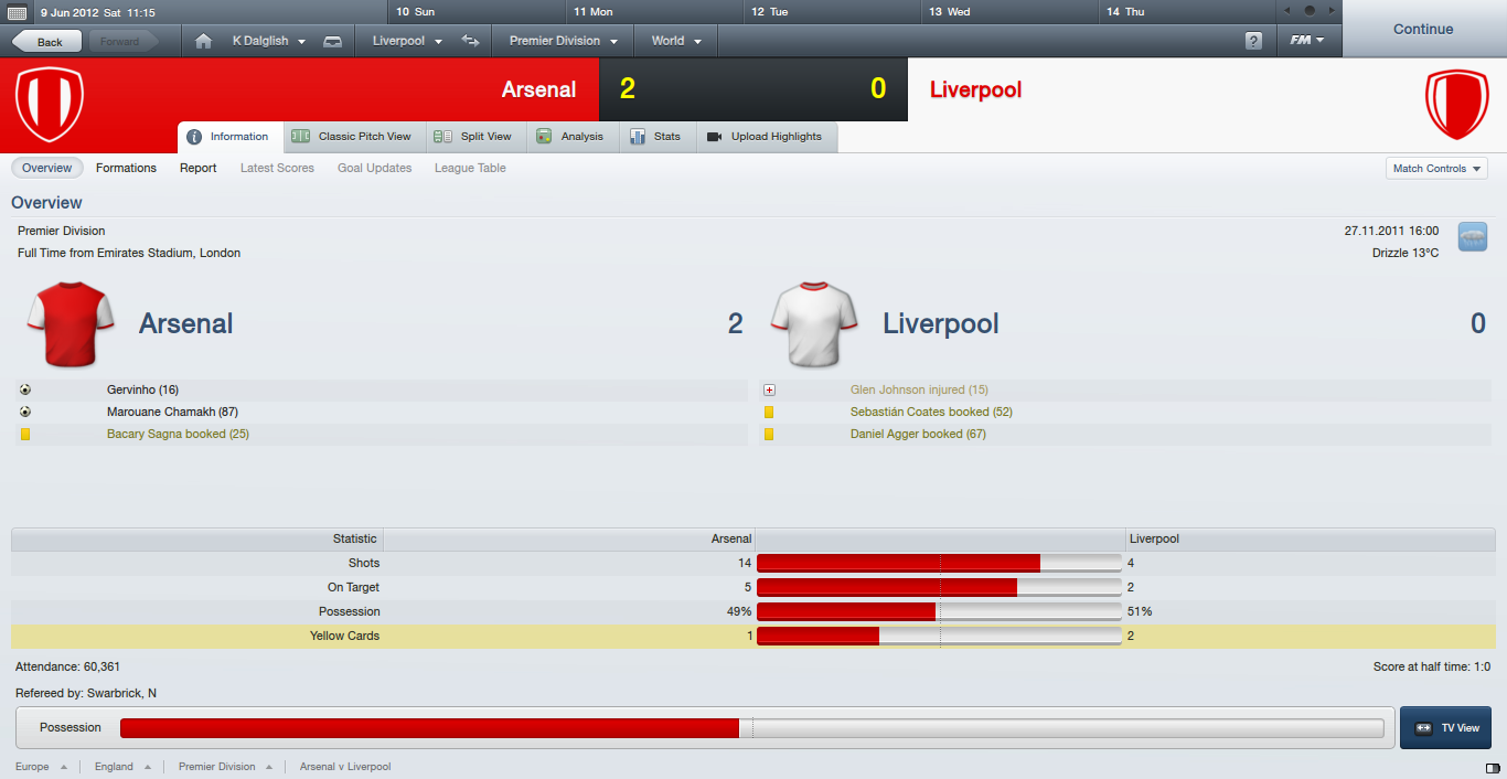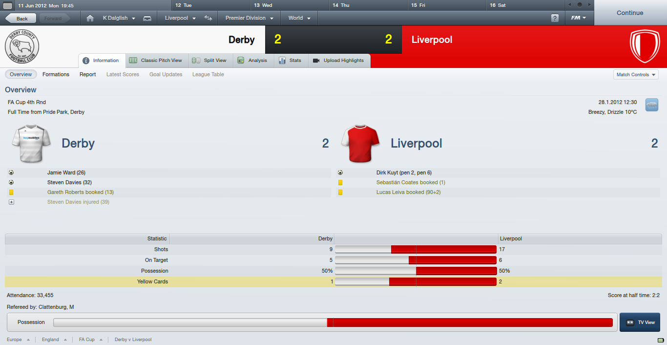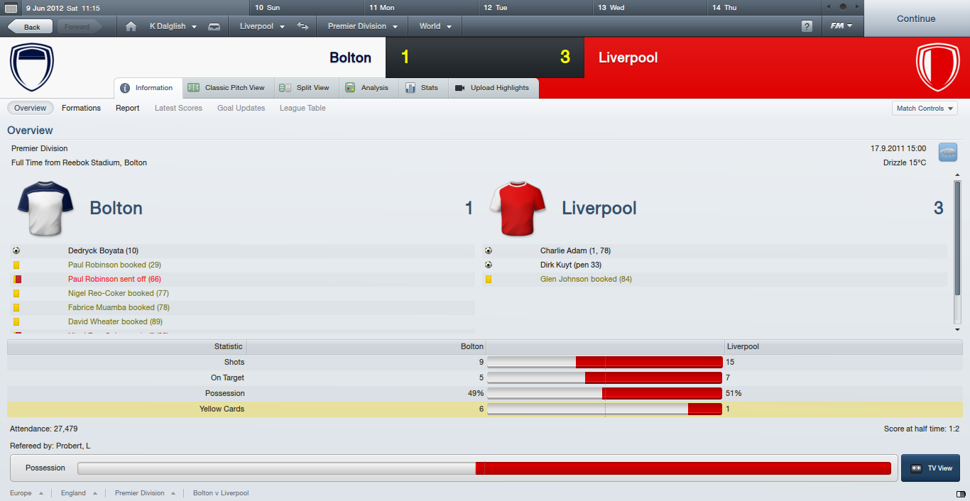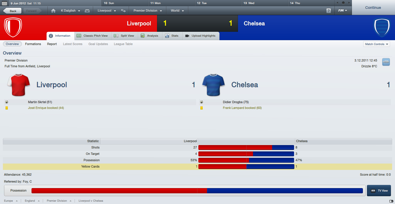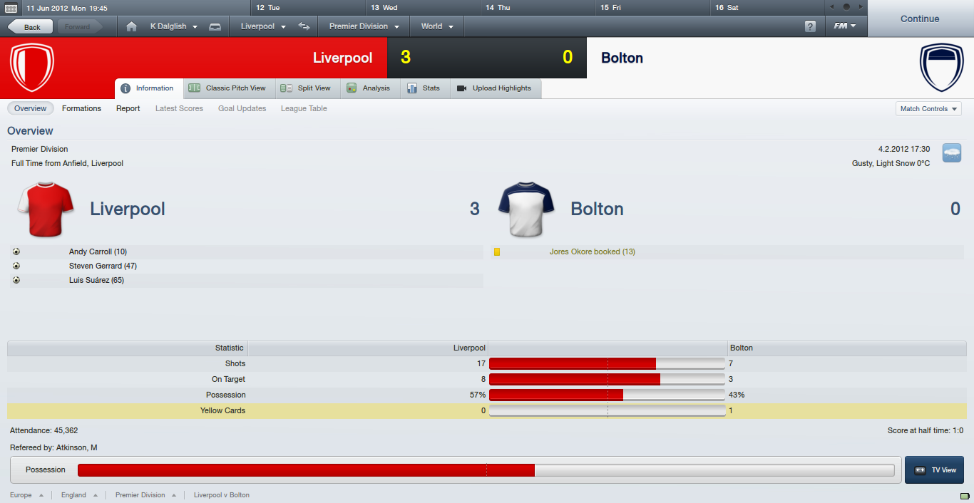 We made another long bus journey to Norwich to face the newly promoted Canaries. This was bound to be an easy game for us, the points were in the bag. The only thin we had to do was try to keep up with United on goal difference: it could be the difference at the end. I chose this as a chance to field our youngster Jordan Henderson. He proved to be well up to the challenge and proved his worth with a 19th minutes goal. Despite the good start and constant domination, Norwich broke quickly and scored the equaliser! Once again, we dominated but could not find the net. Finally, however, Agger and Kuyt scored one each 2 minutes after one-another. Suarez added the fourth not long after the hour mark, it was a nice win for us.