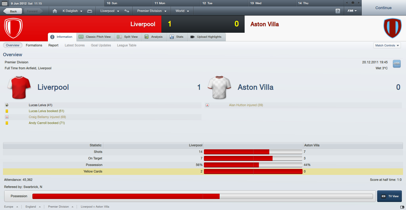 I knew this game would be a bore-fest, but Stoke could prove tough to beat. Although, my confidence was high after dispatching Manchester United the previous game. The proved to be pretty easy for us; especially since Suarez scored just 13 minutes in. That put my worries to rest following his yellow card before the goal. There was nothing else worth noting, although Kelly was injured late on. The only thing I had trouble understanding was our lack of goals. We dominated possession and had over 15 shots. What was preventing us from scoring?
