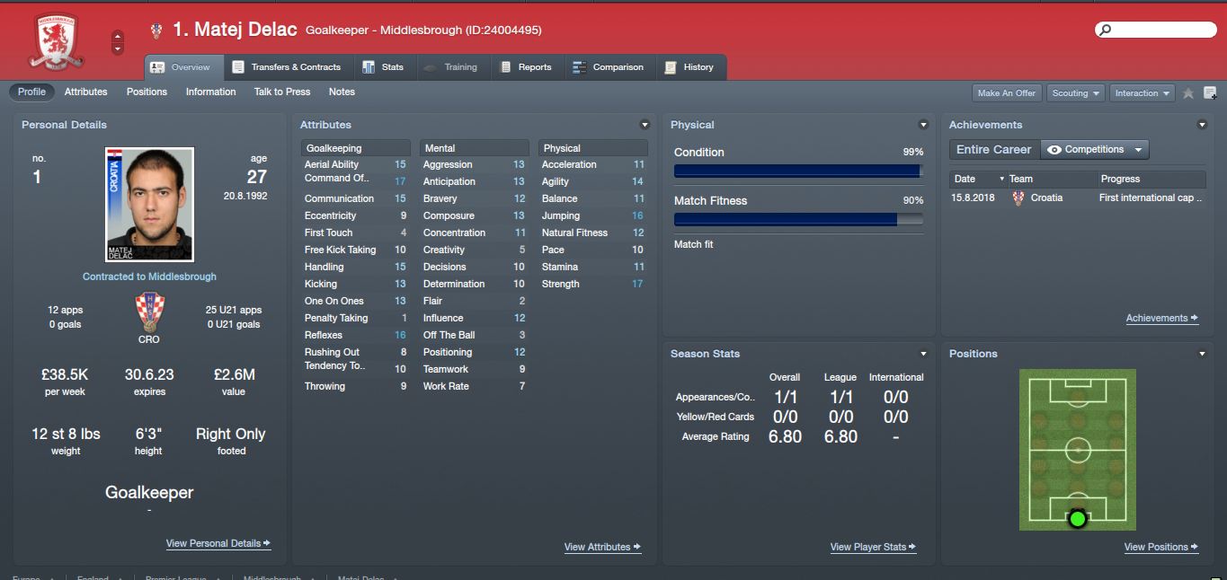 Another non regen Croatian keeper who I signed in January. This is the reason I sold Dubsky as I seen Delac was a free agent and couldn’t pass him by. I had tried to loan him from Chelsea a few years into my career but he said he wouldn’t play for a small club, quite ironic.