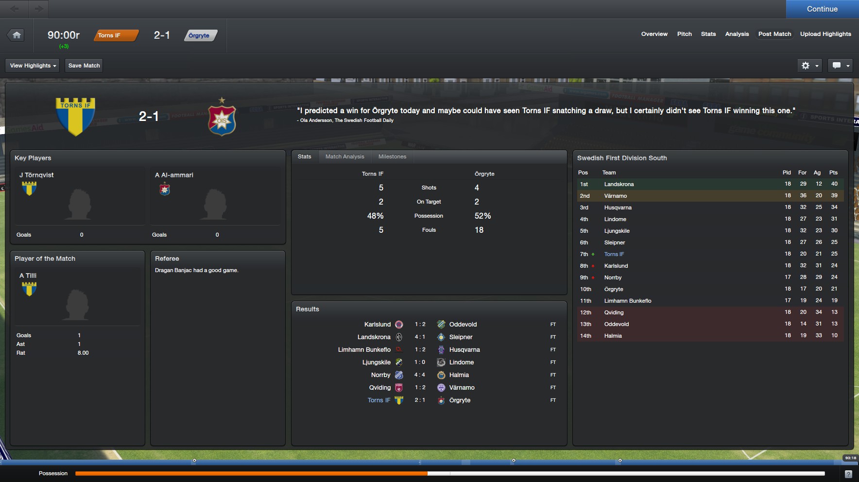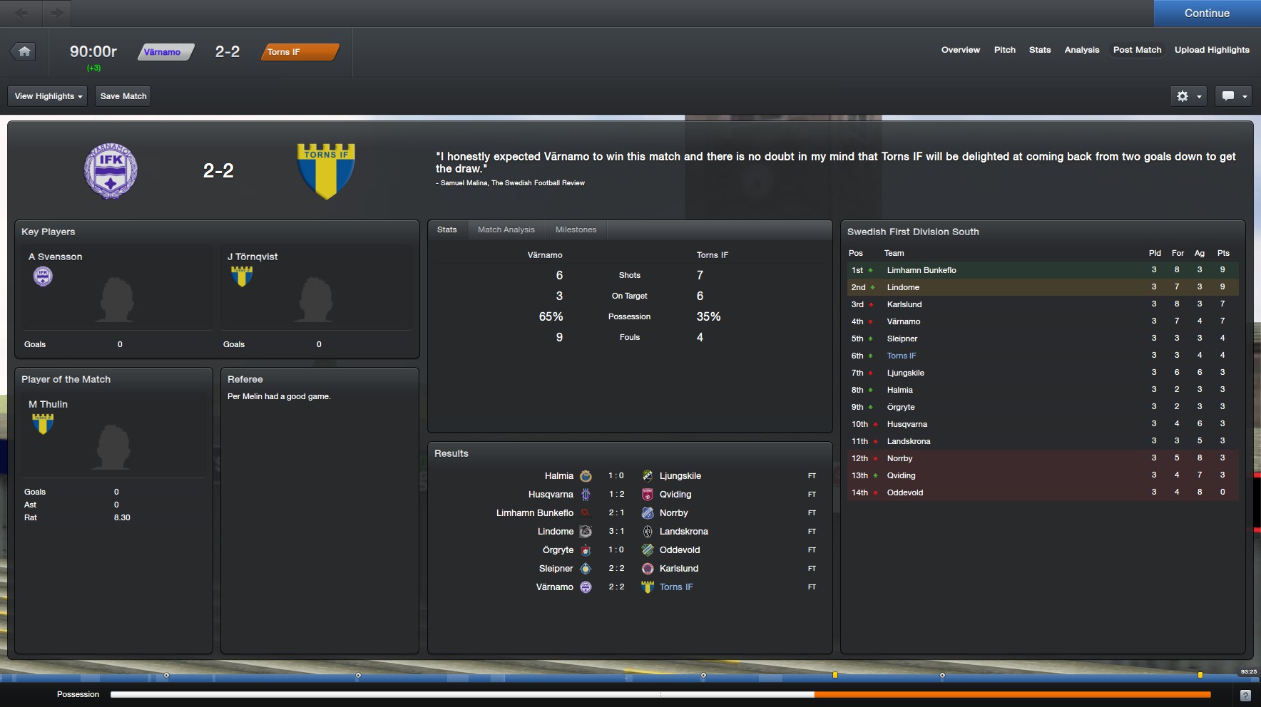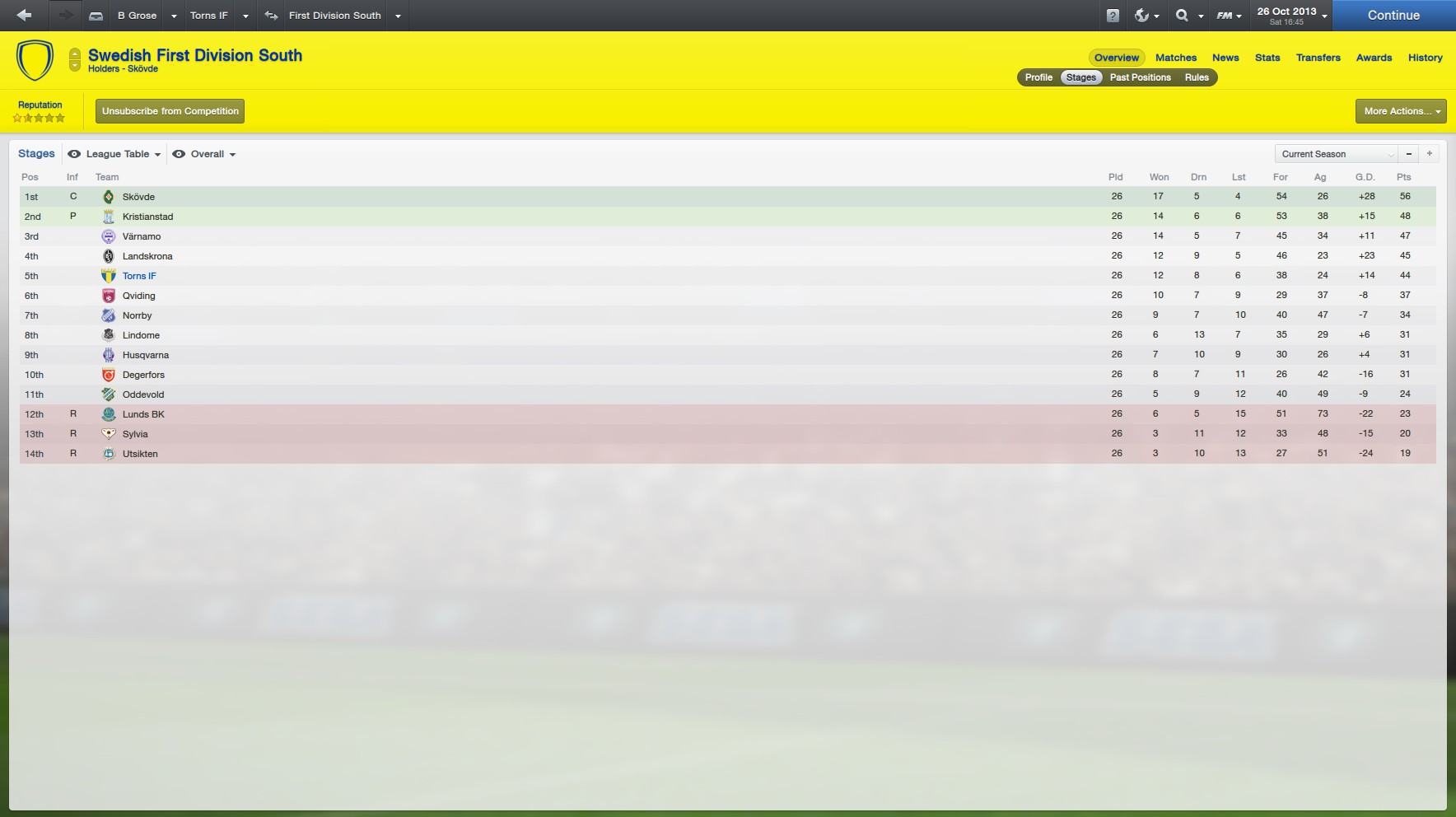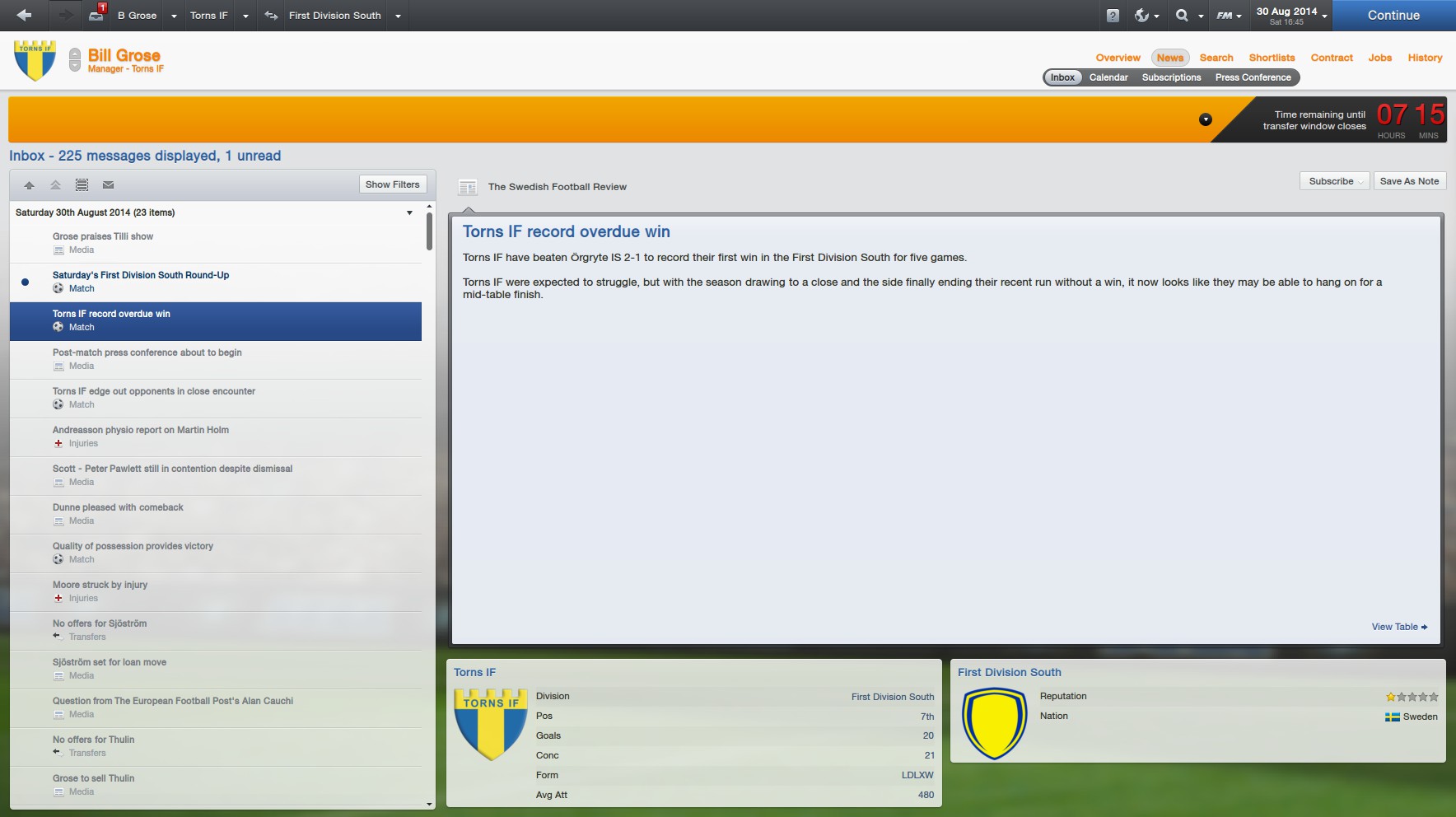I would like to start this update by stating that I am no longer enjoying life in charge of Torns IF and at this stage I am unsure if I will accept a contract renewal for the 2015 season. I am growing increasingly frustrated by my team's inability to score when they should and by our league position which has been all over the lower half of the league for most of the season so far.