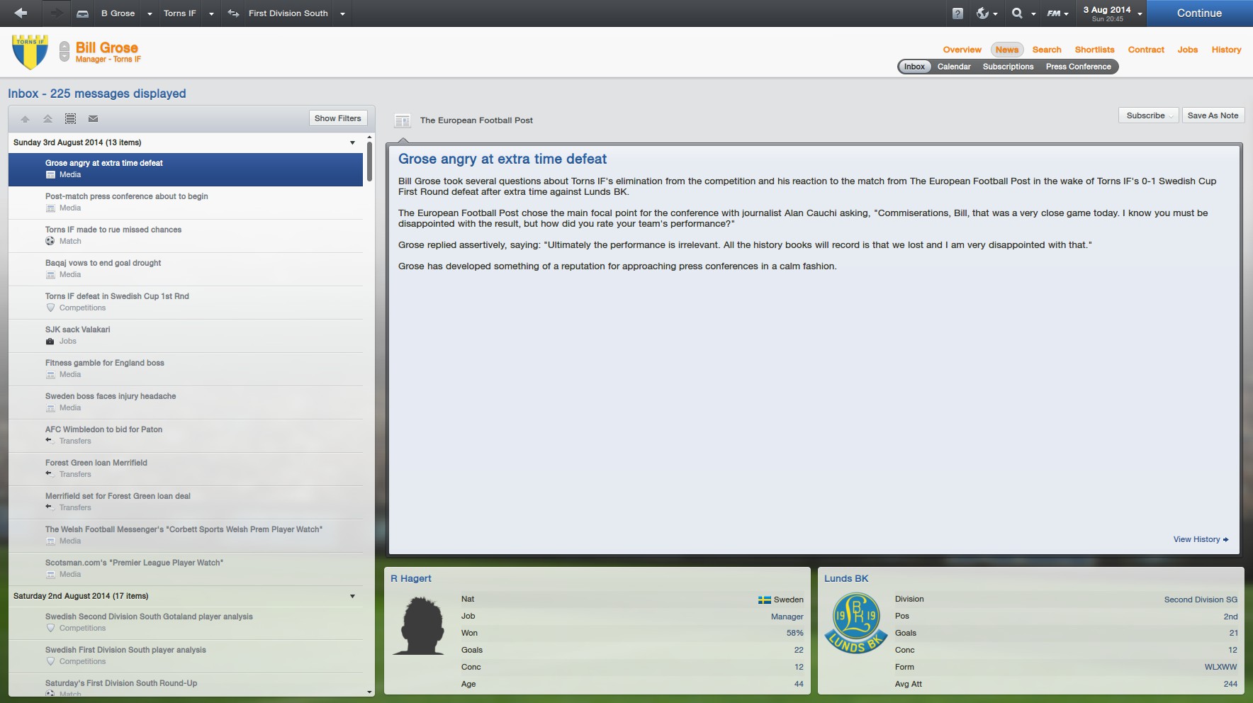 Our first match of August was a Svenska Cupen First Round match away to nearby side Lunds BK who had been relegsted from First Division Sodra last season, I was confident of winning this game and once again advancing to the Second Round but unfortunately this was not to be as Lunds BK won the match 1-0 in Extra Time. I was absolutely fuming at this result and made sure the team knew it.