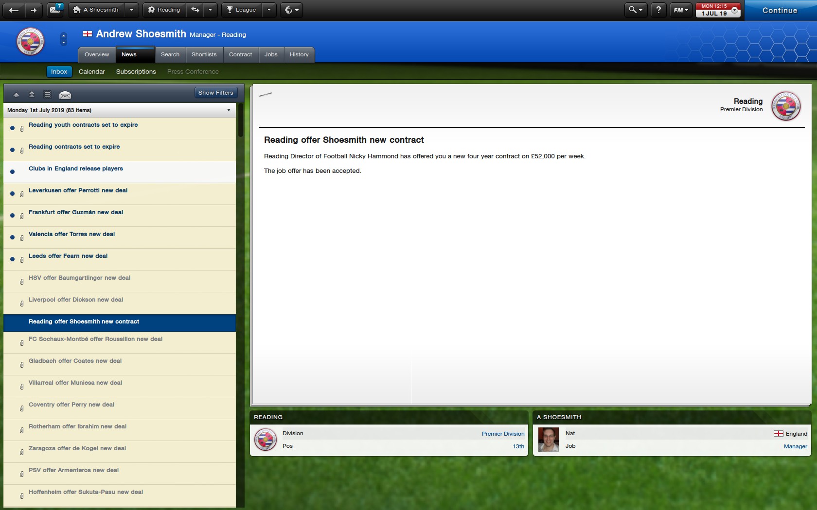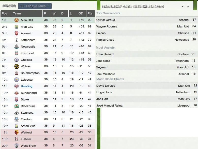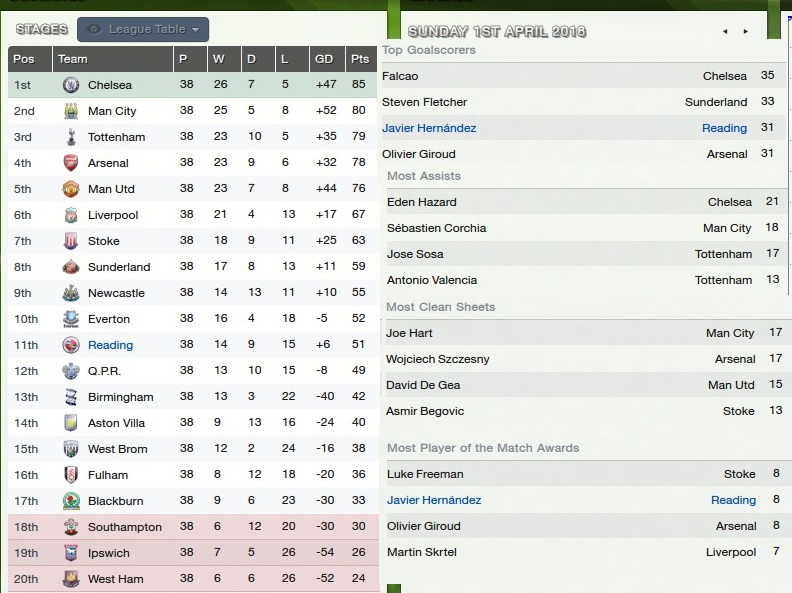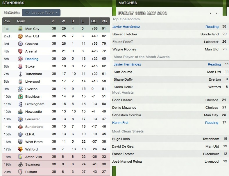 We finished 11th last season, but Hernandez was on fire. I think that if I can stop the inconsistent form a little, and get Hernandez firing again, there is no reason why a top 10 finish, the highest I will have achieved while at Reading, is not possible, but I aim to try and push just above that, in to 7th or 8th, and in to the Europa League. It will be tough.