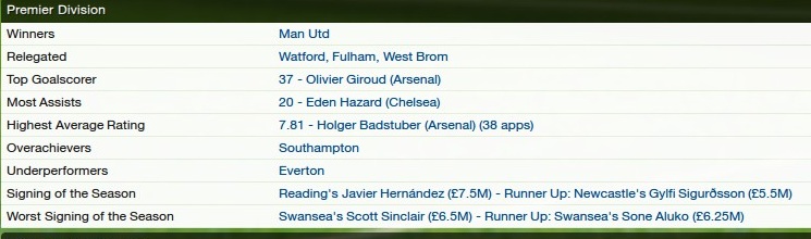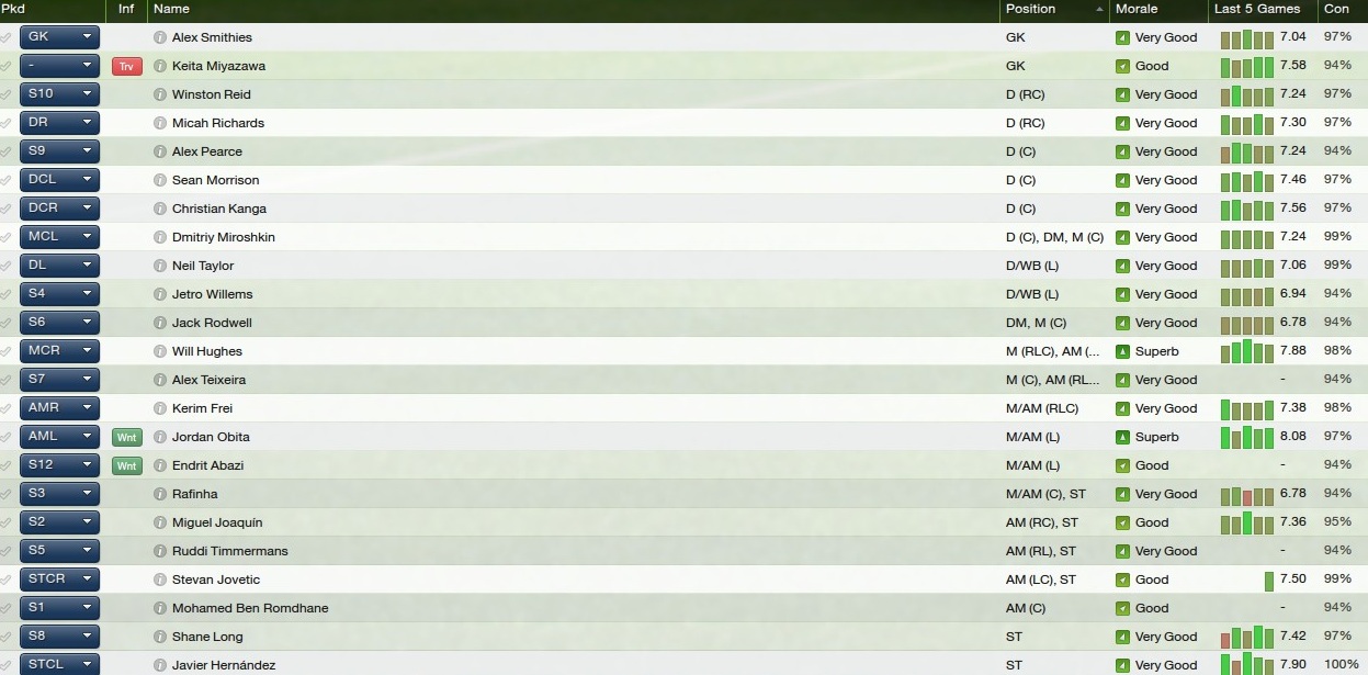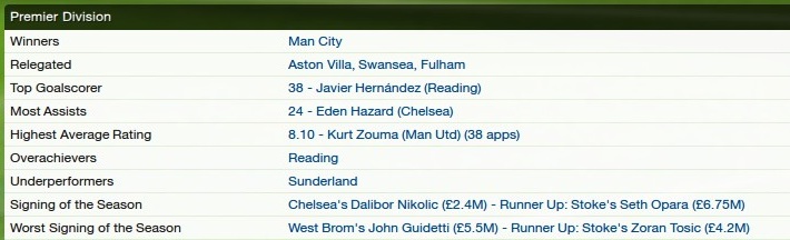 The seasons best players were: SHANE LONG-JAVIER HERNANDEZ-SEAN MORRISON-CHRISTIAN BENTEKE-CHRISTIAN KANGA-KERIM FREI-JORDAN OBITA-ALEX PEARCE-ADAM LE FONDRE-DMITRIY MIROSHKIN-MICAH RICHARDS-JETRO WILLEMS-WINSTON REID-RAFINHA-JEM KARACAN-a real team effort, but the main man, was undoubtedly Hernandez, without his goals, this would not have been possible.
