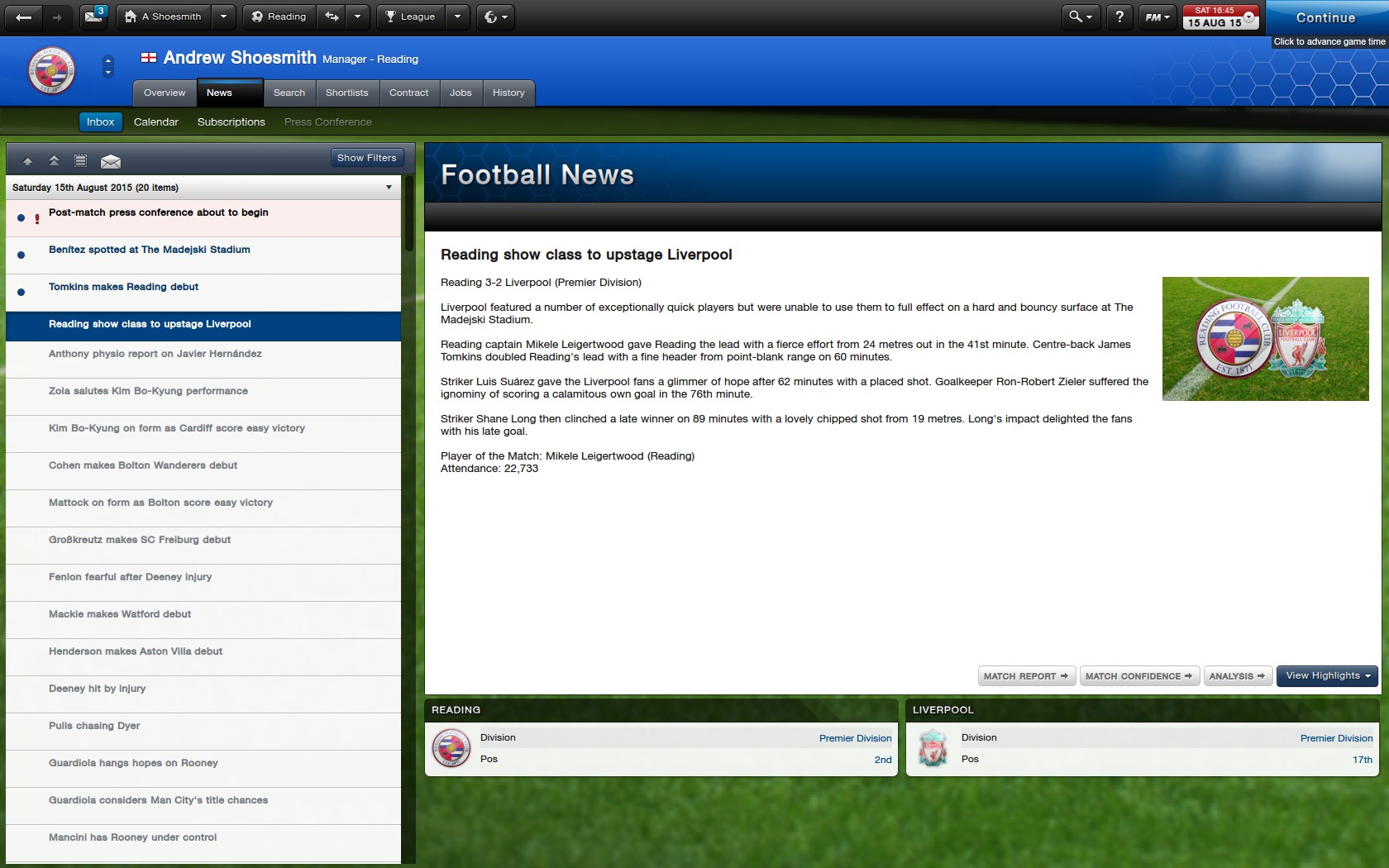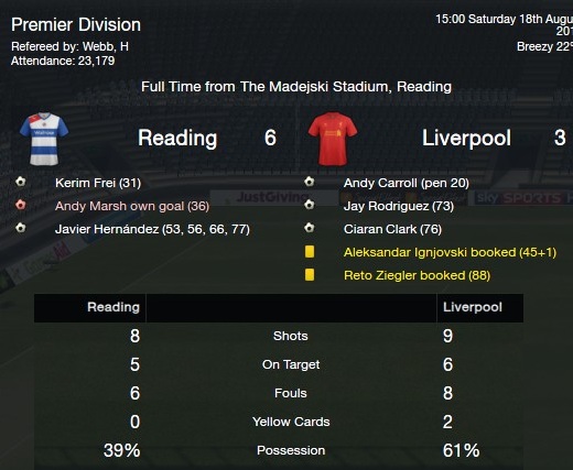 First game, in a fixture list that is not kind, we beat Liverpool. WE DONT BEAT LIVERPOOL, WE THRASH LIVERPOOL! IN A GREAT GAME. MY GREATEST RESULT ID SAY. 6-3 WIN FOR READING.