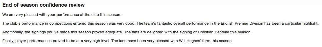 The Board are very pleased with me. We did well in all competitions, especially the premier league, which they say is a fantastic finish.
