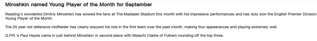 My young Belarus prospect wins young player of the month, Miroshkin.