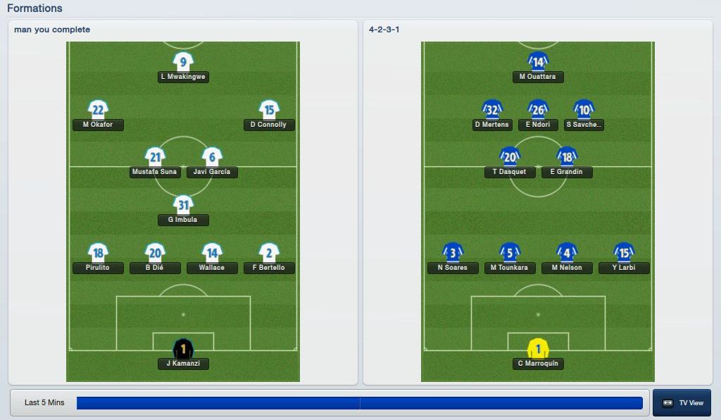 OM (4-1-1-2-2):Kemanzi; Bertello, Wallace, Mendoza, Pirulito; Suleiman, Kabore;