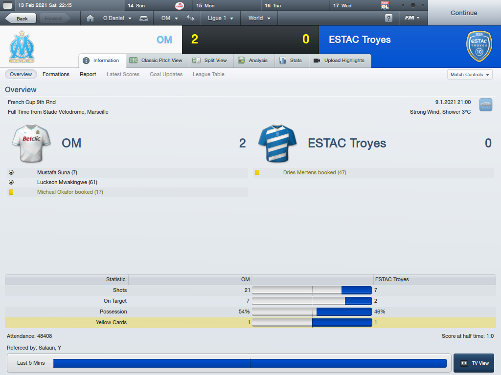 A very confident performance from my OM side, although I was disappointed with the quality of the finishing, I had 31 shots, 13 on target but managed to score just 3 goals. A lot of the misses came from Ayew who has now failed to score in 7 games for my club. I really hope that changes soon.